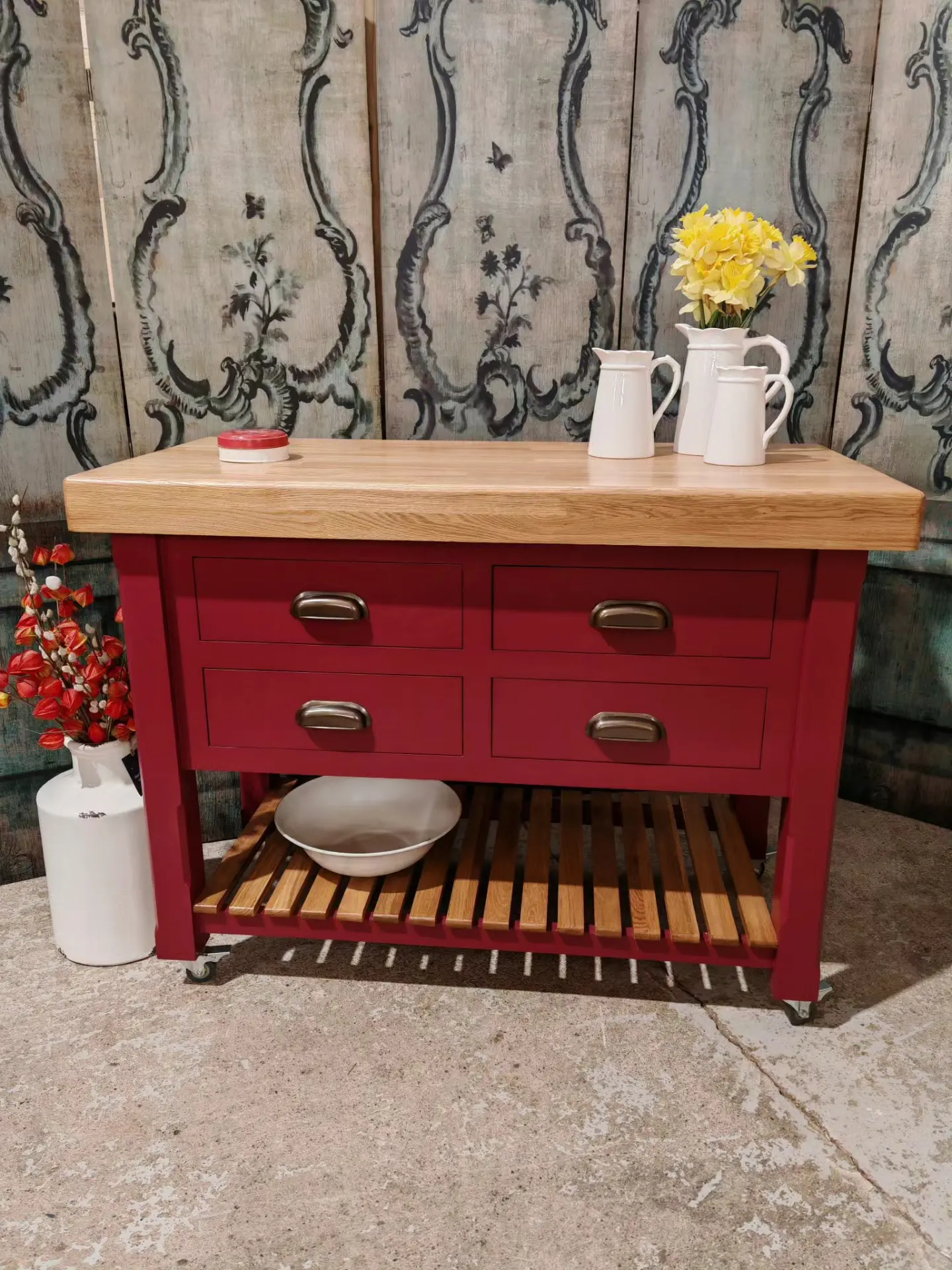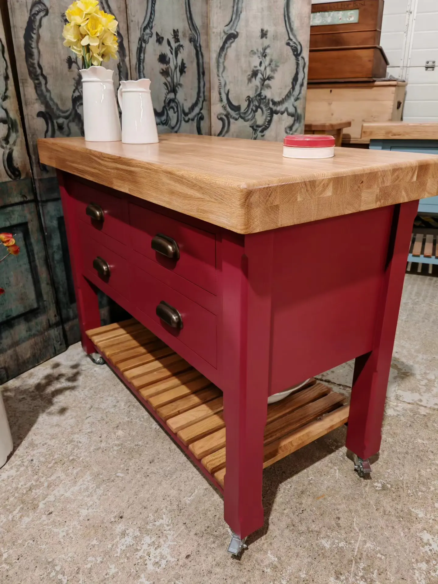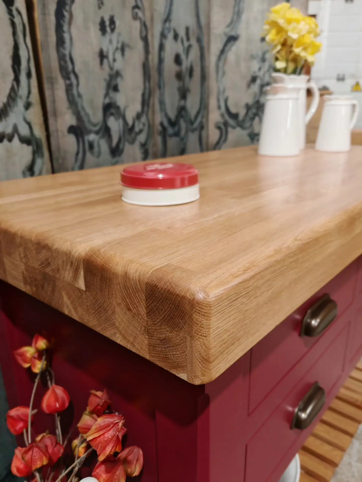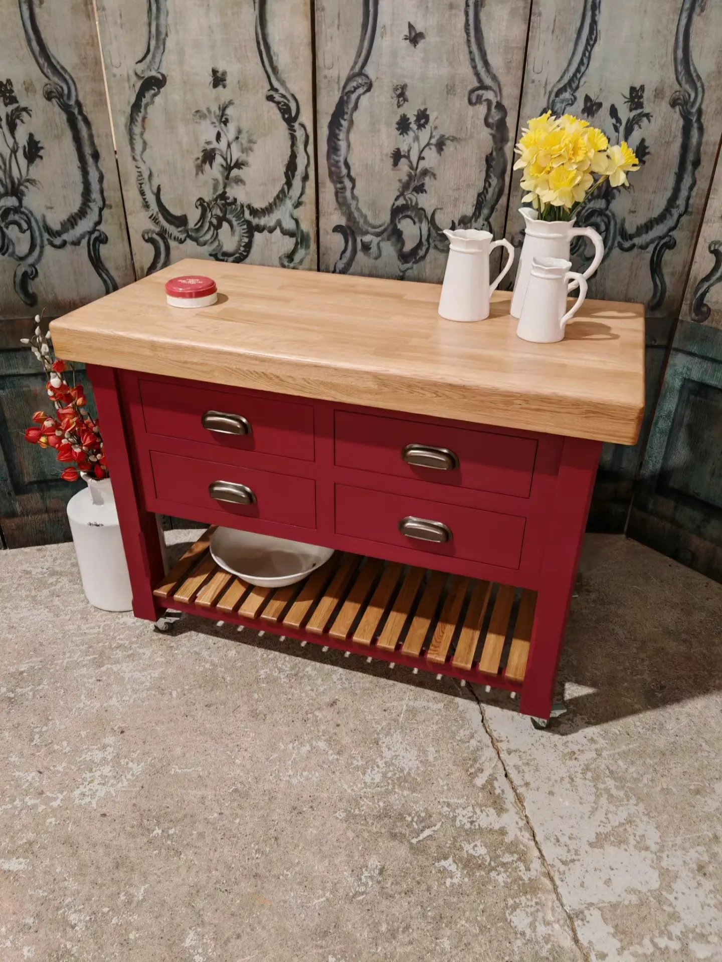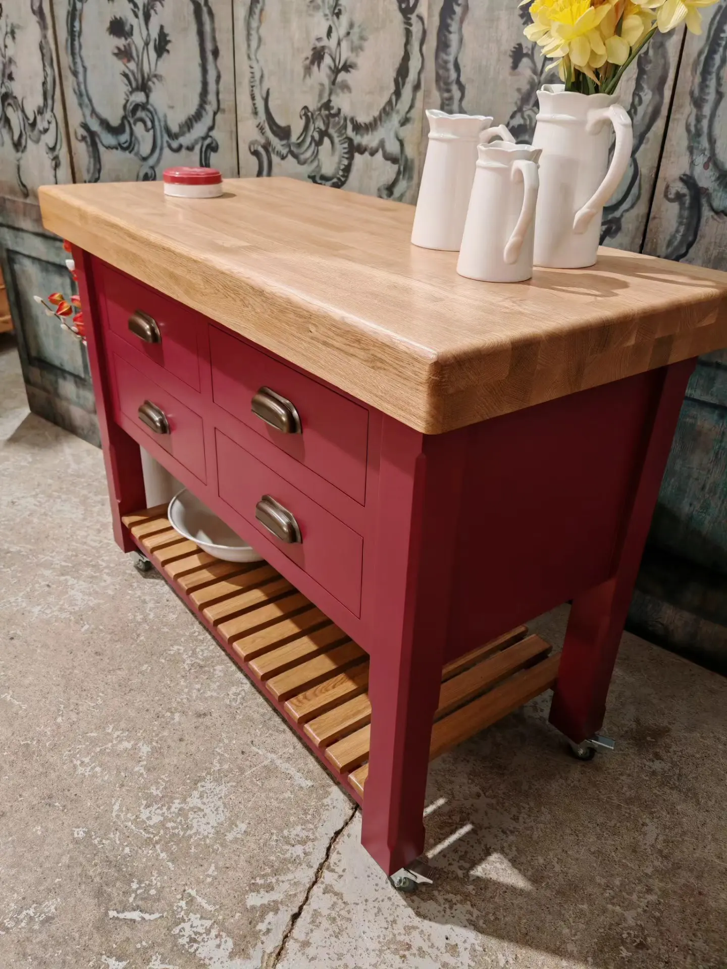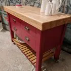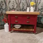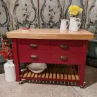 Finished in a heritage red with a solid oak 80mm thick wood worktop, this piece perfectly balances rustic warmth with classic elegance.
