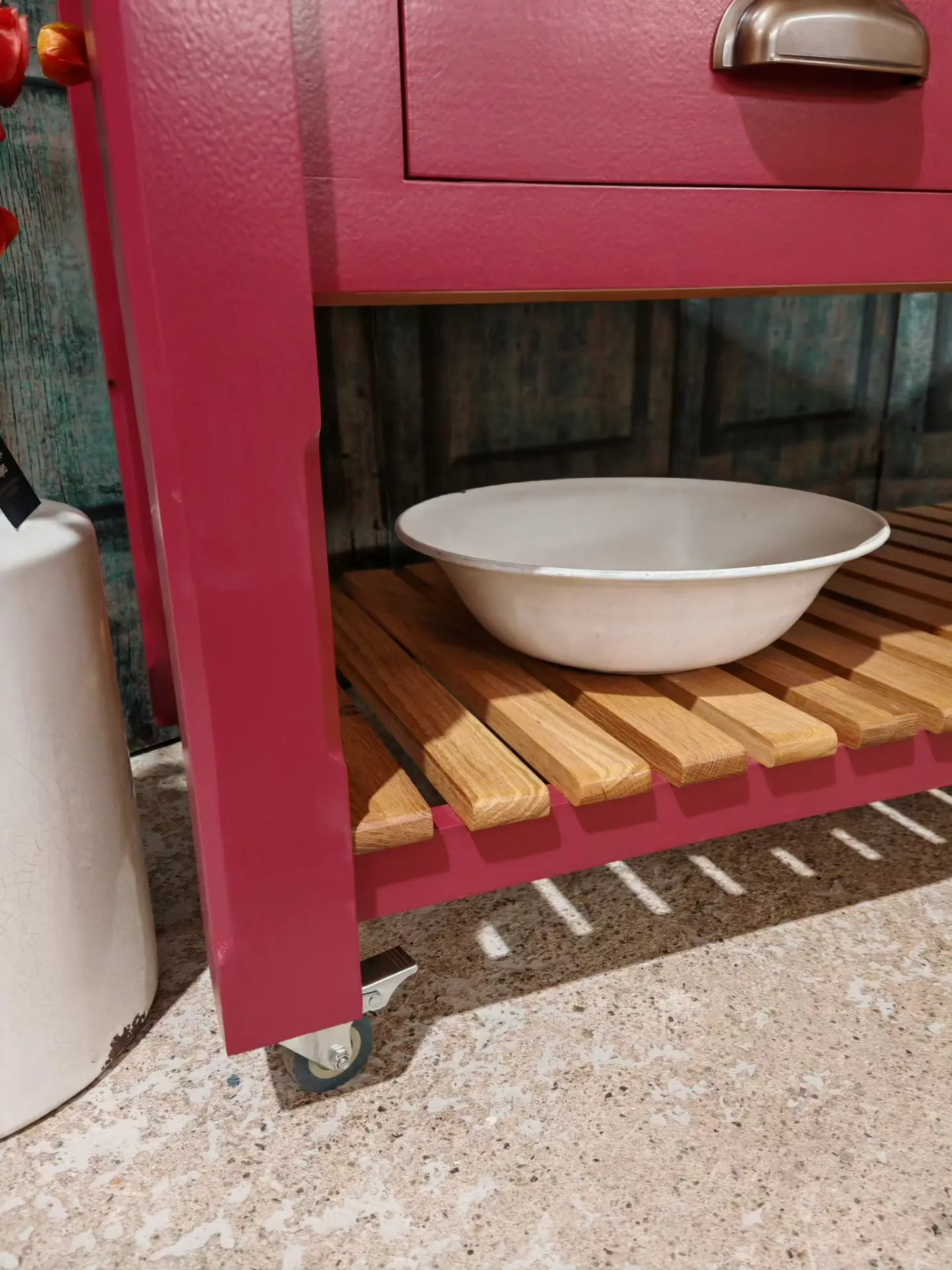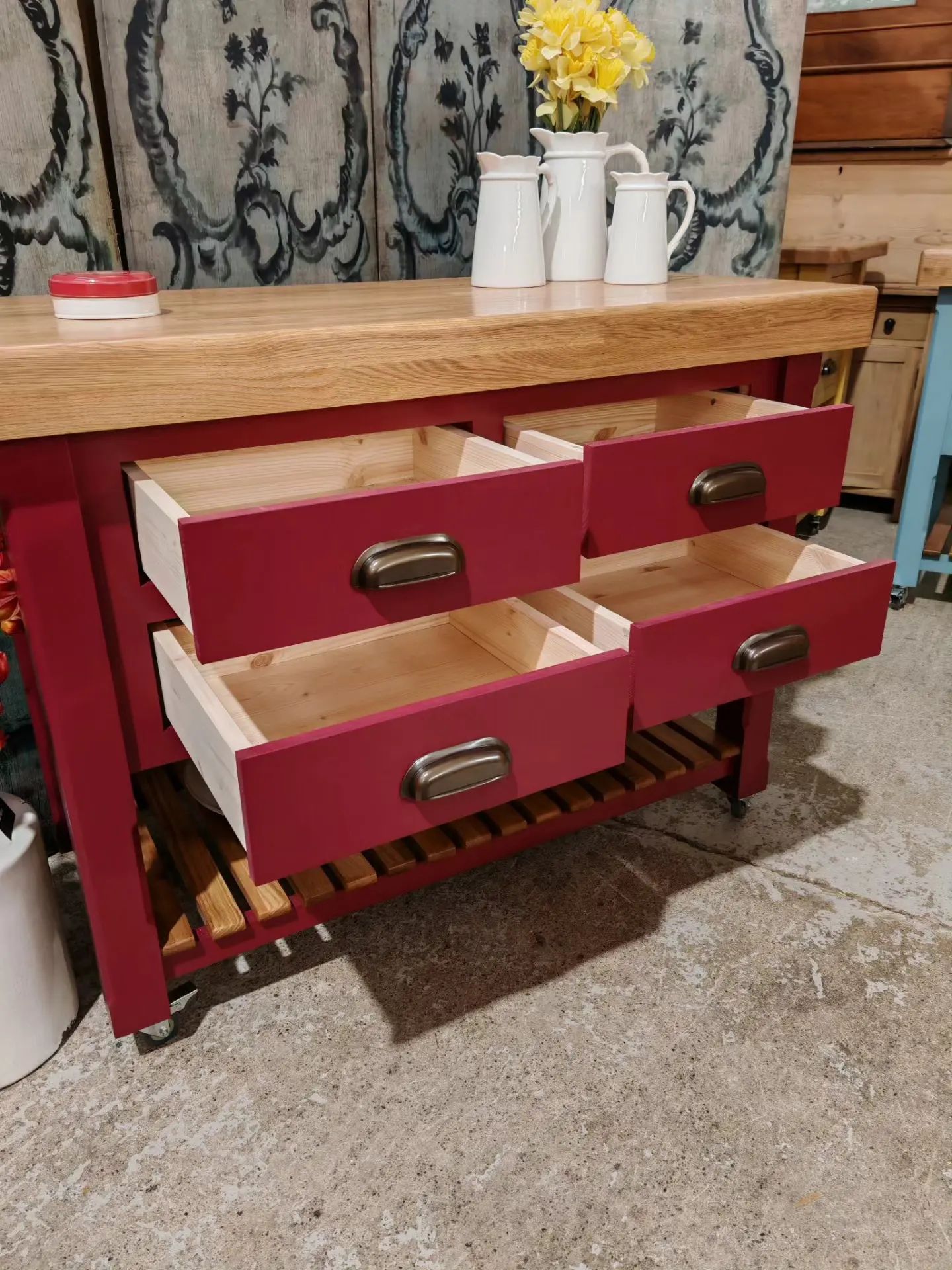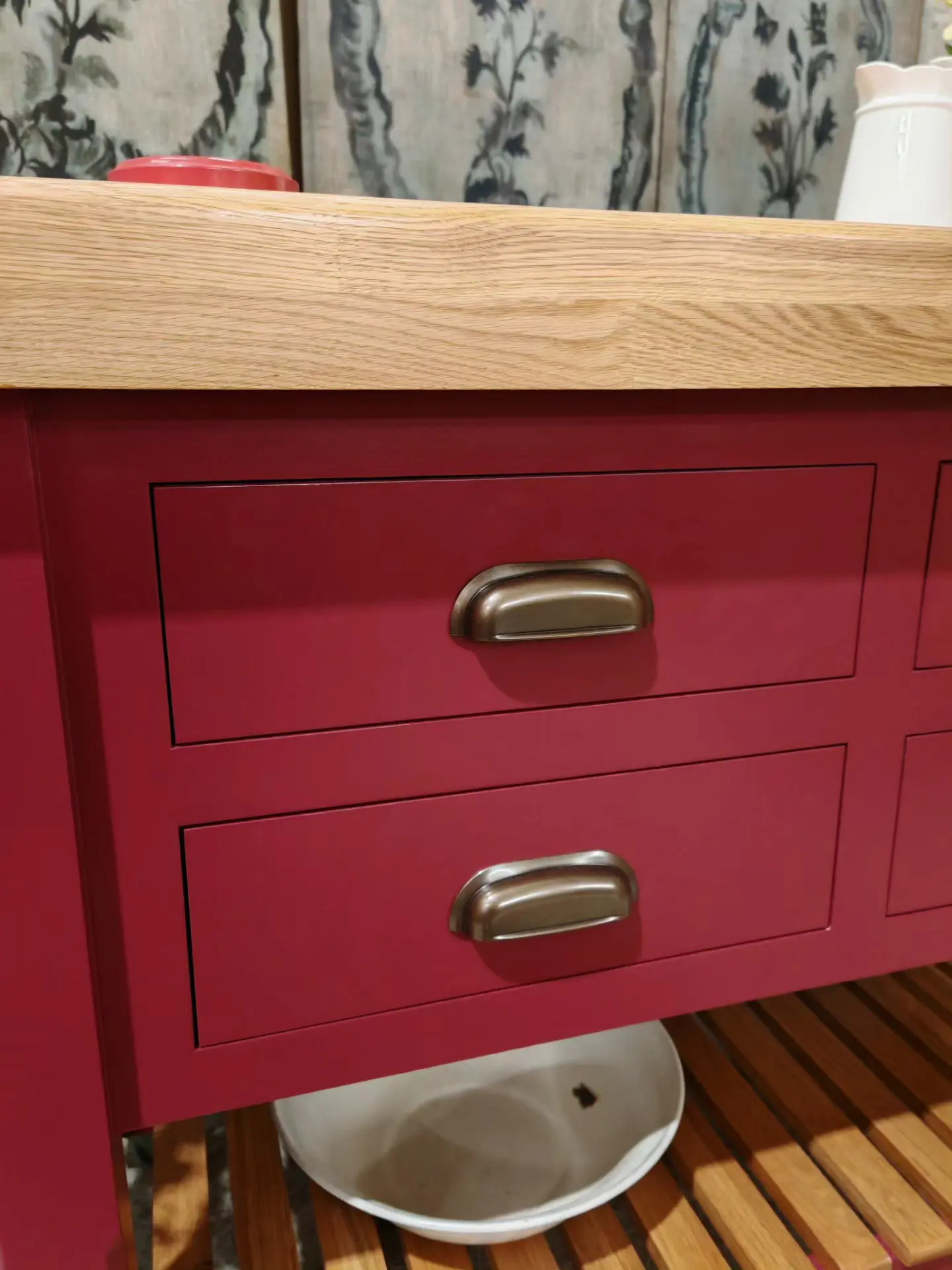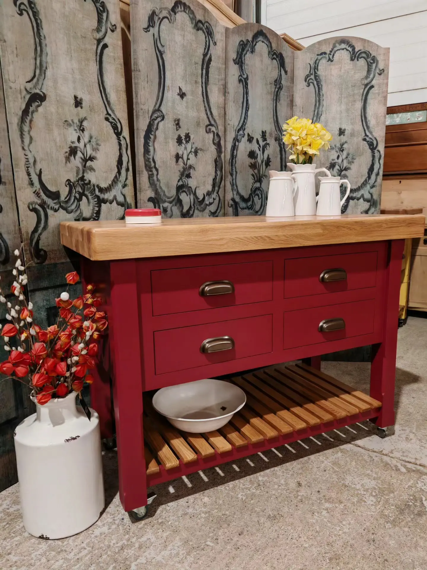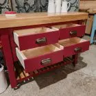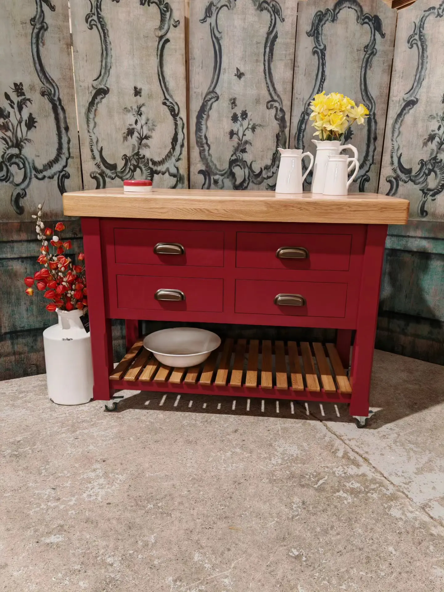 Finished in a heritage red with a solid oak 80mm thick wood worktop, this piece perfectly balances rustic warmth with classic elegance.