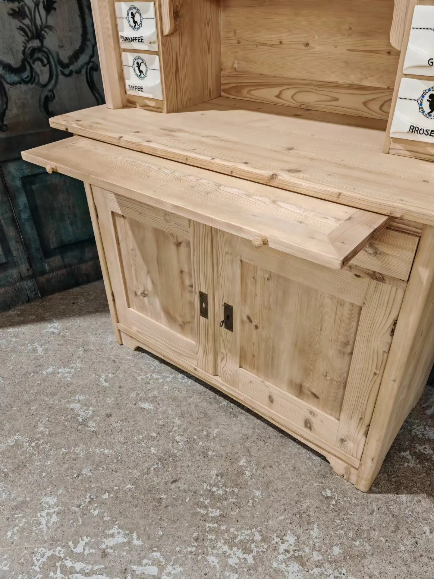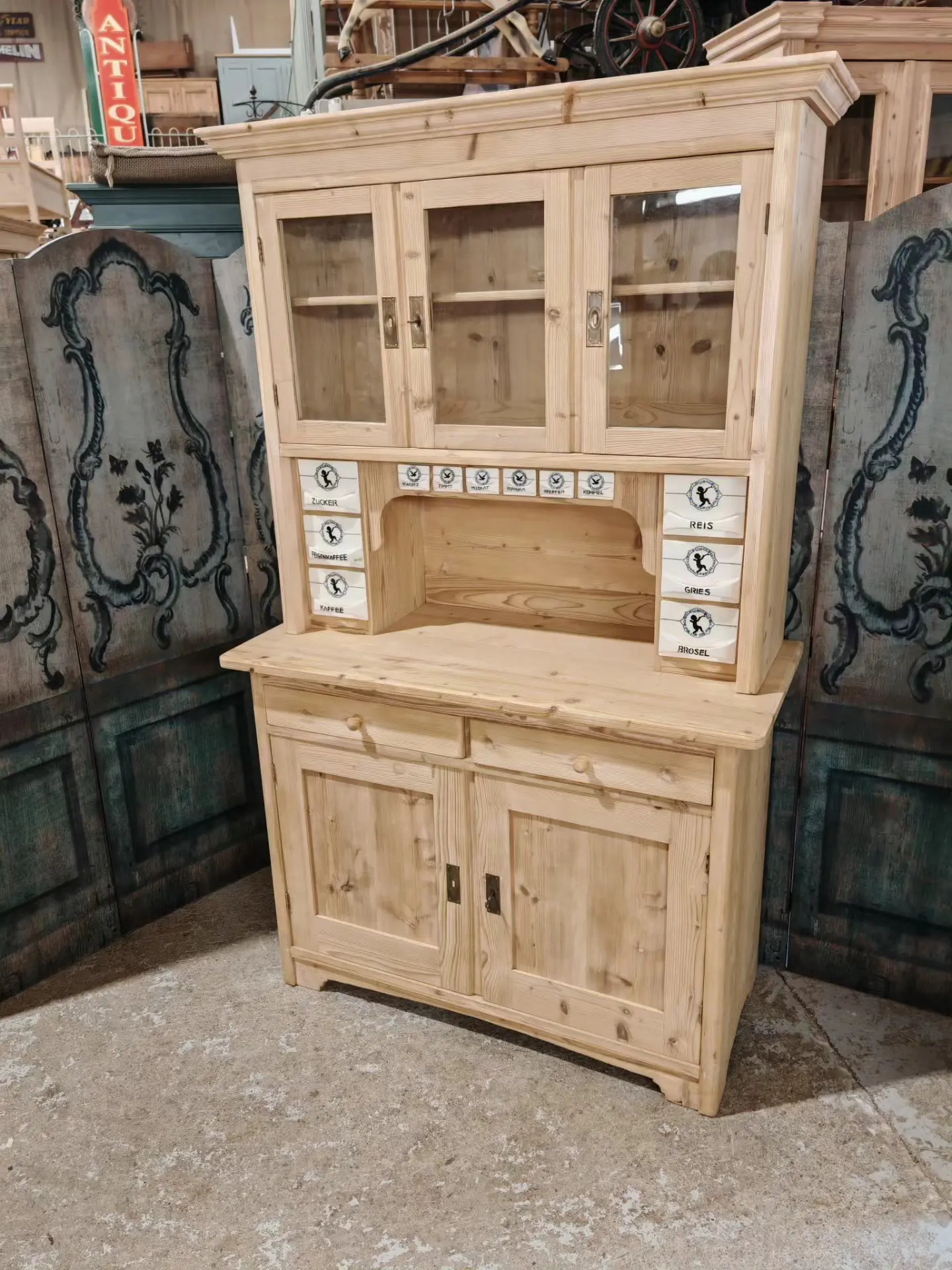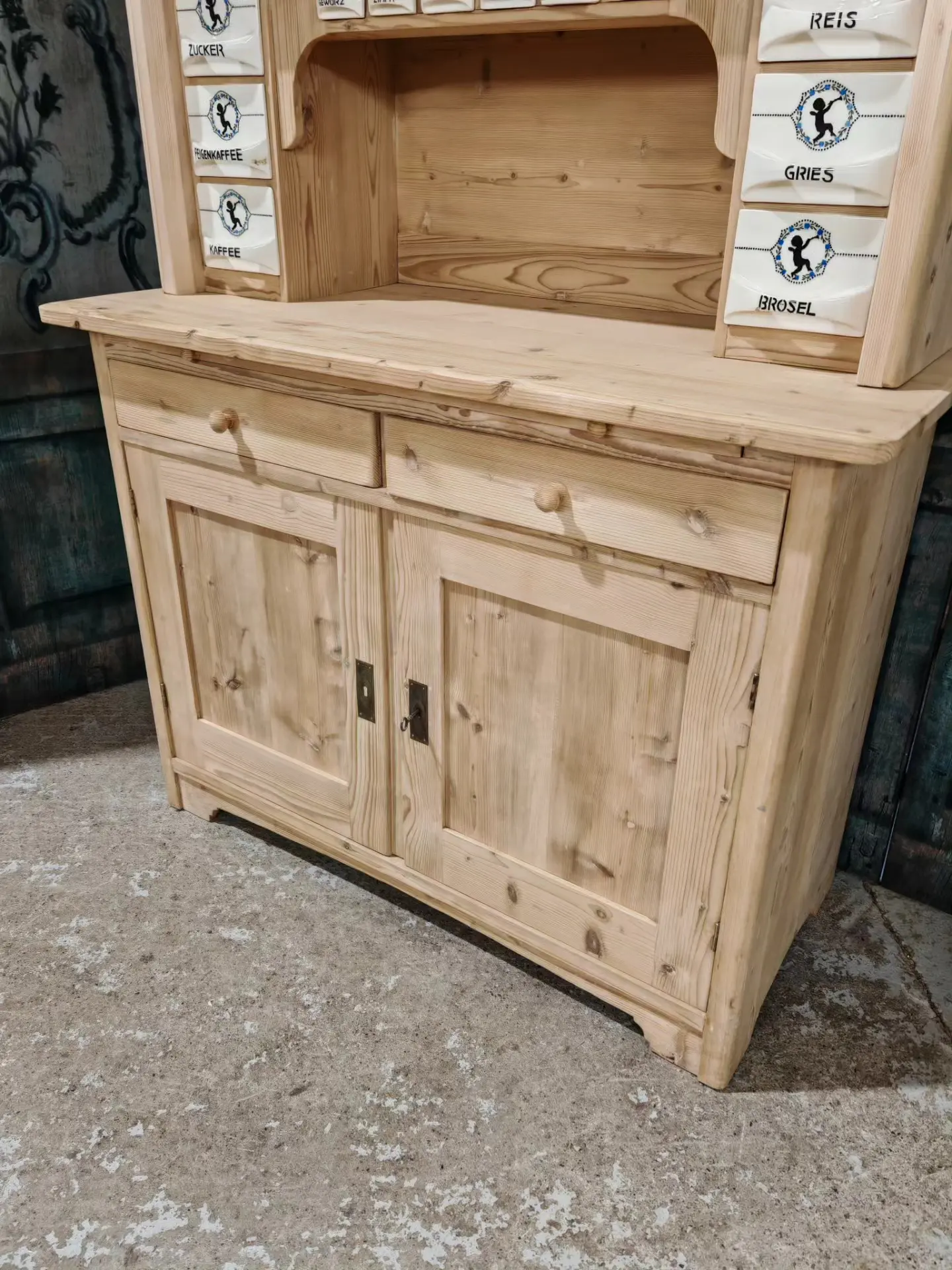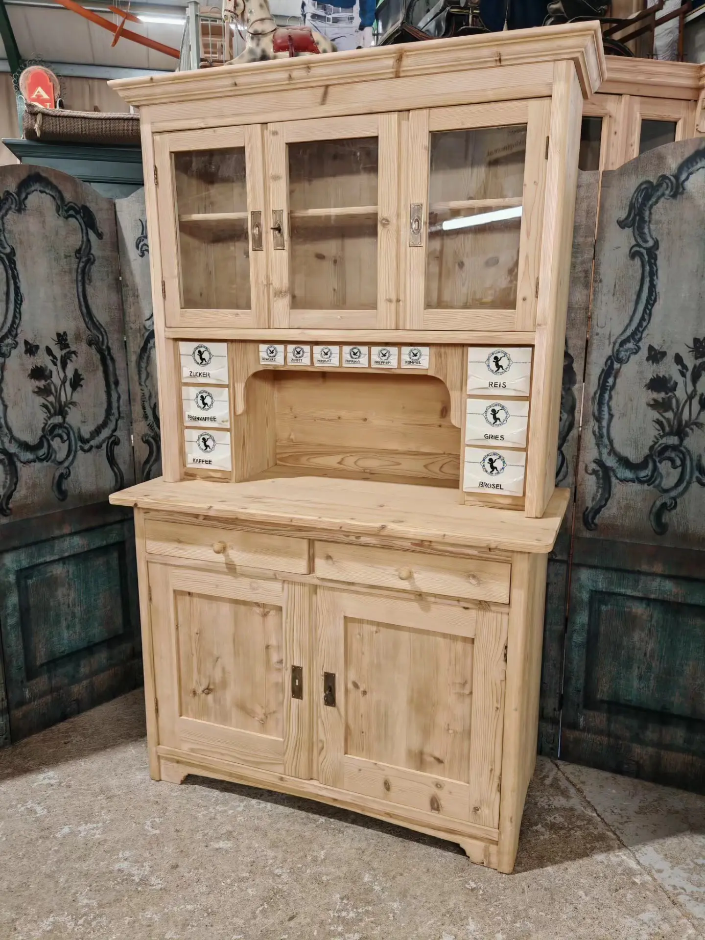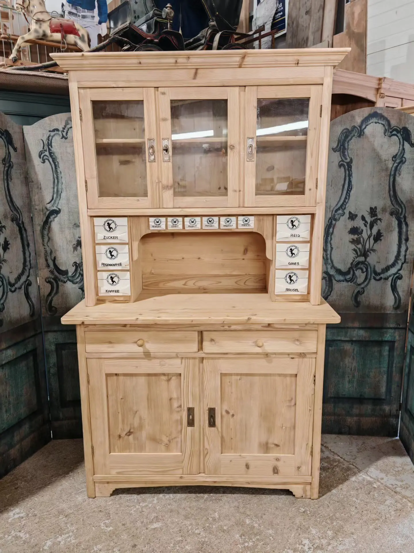 This lovely antique pine German dresser is very handsome with its glazed rack and original set of porcelain spice drawers.