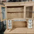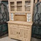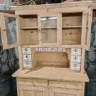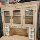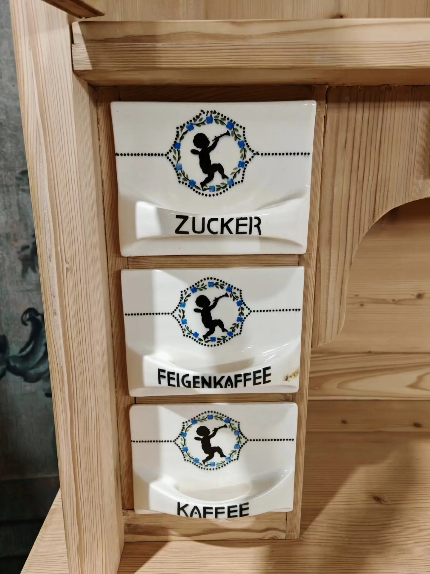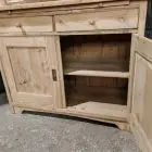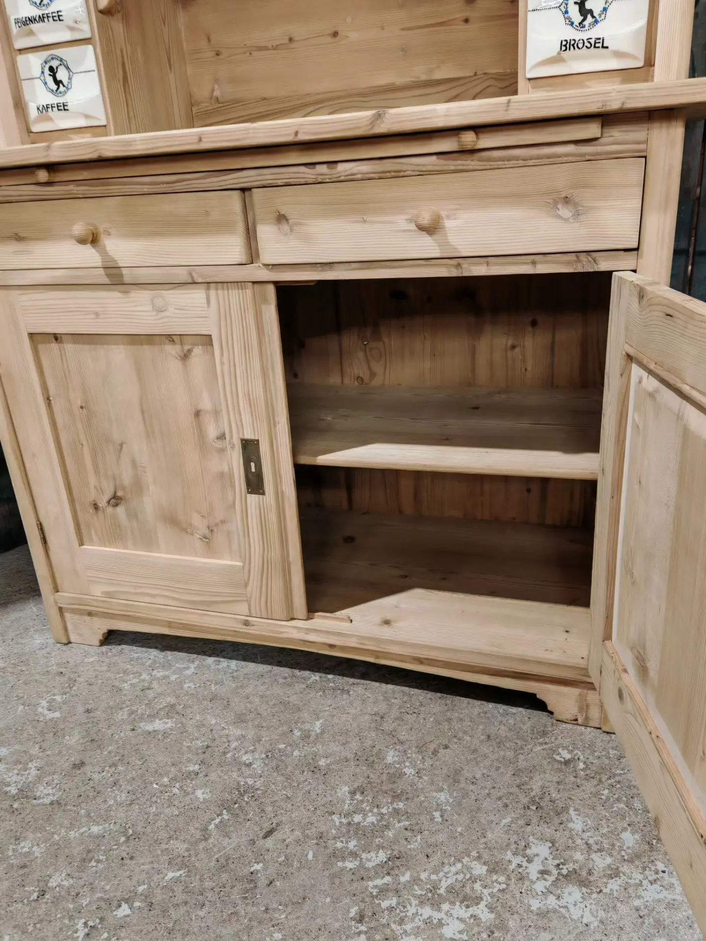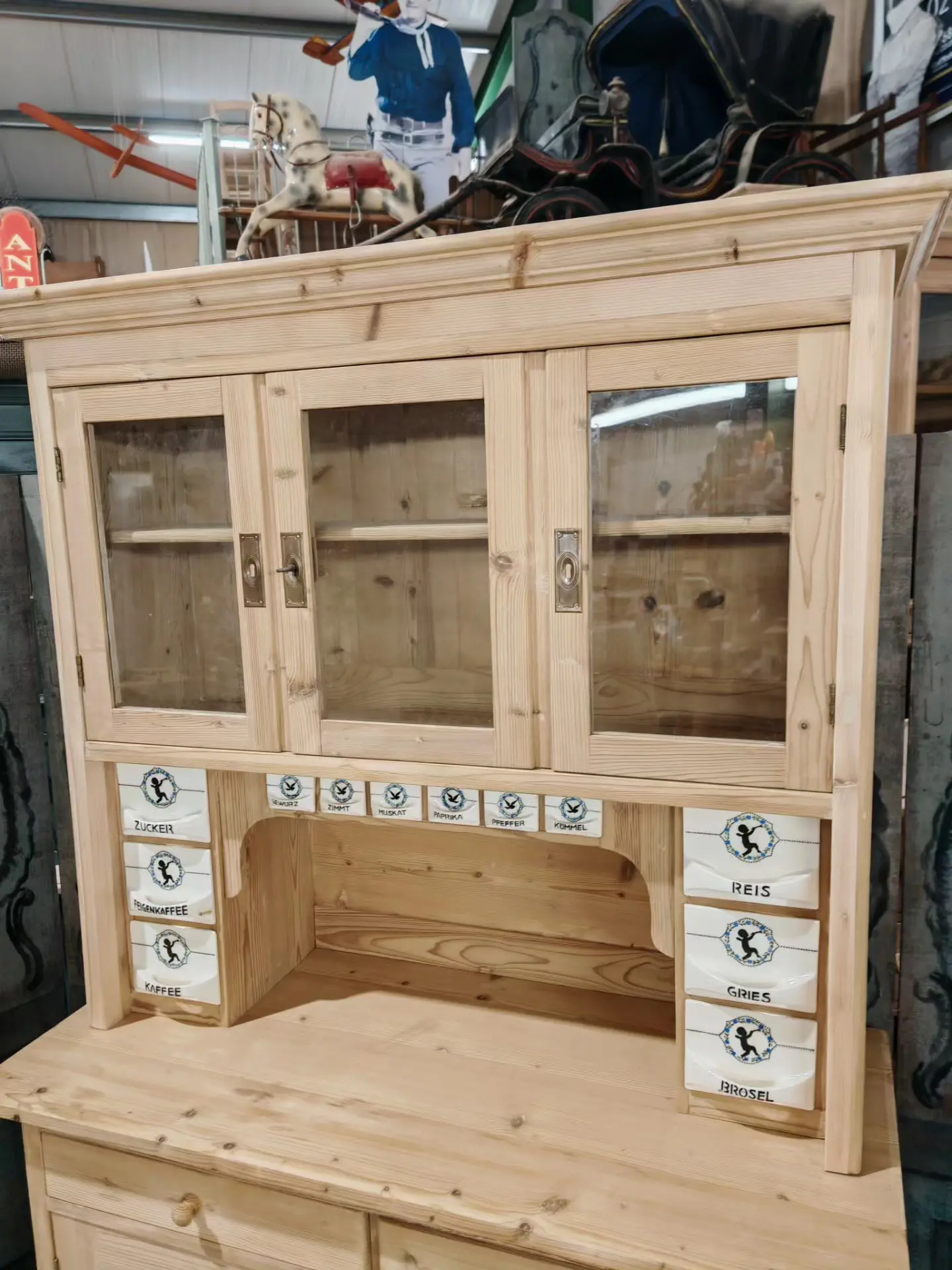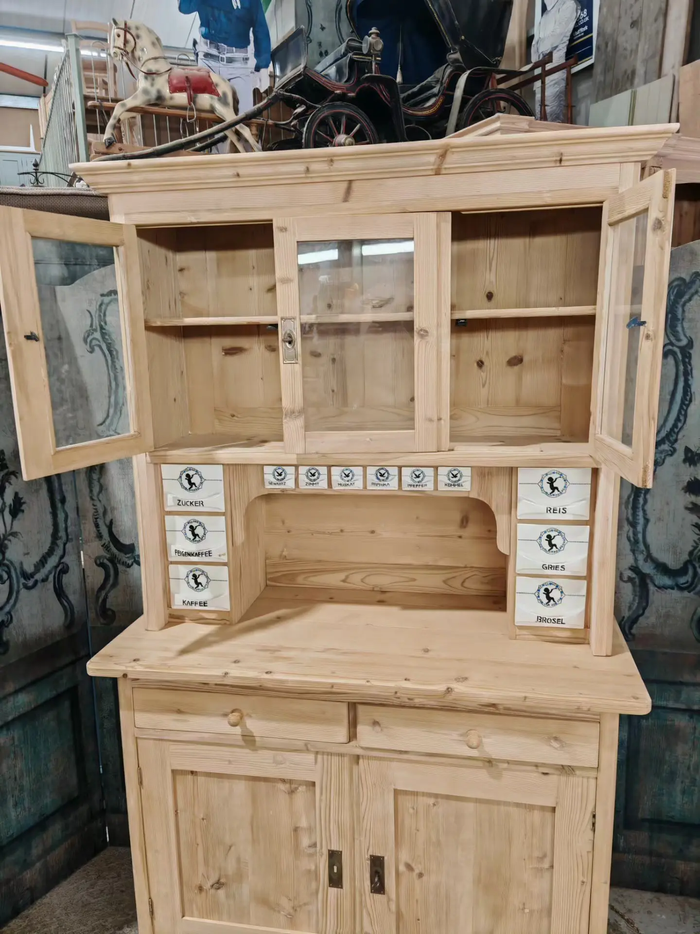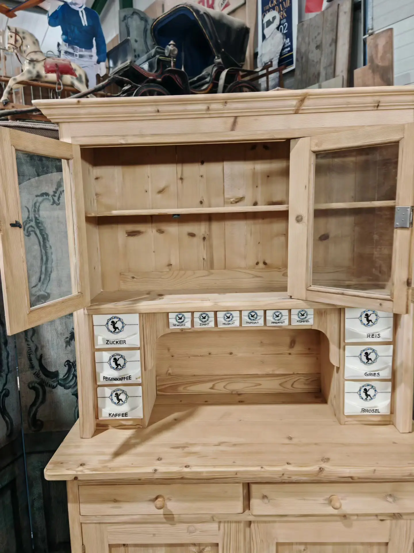 This lovely antique pine German dresser is very handsome with its glazed rack and original set of porcelain spice drawers.
