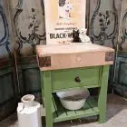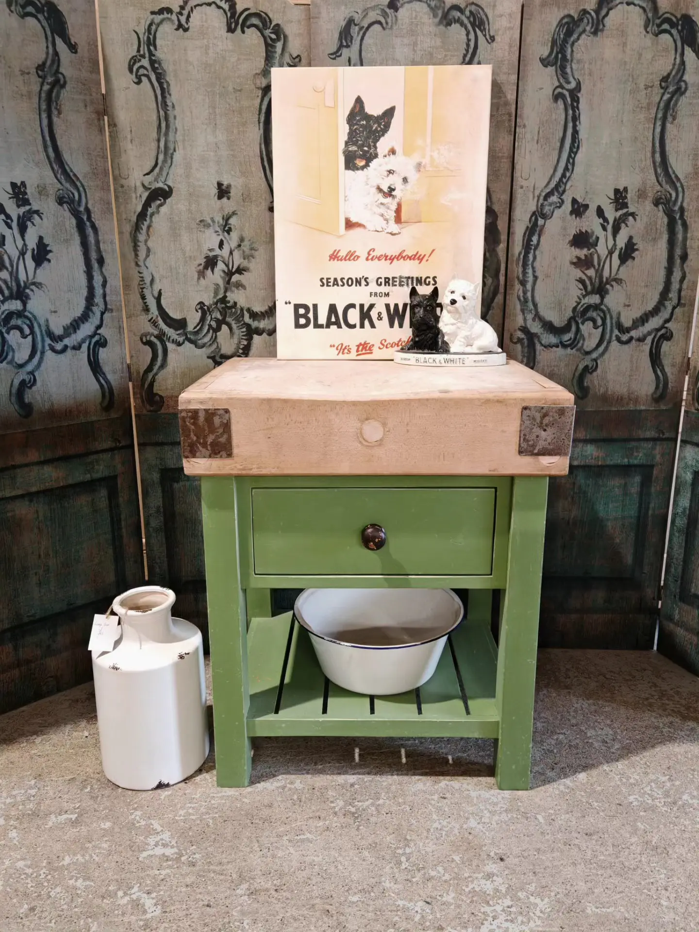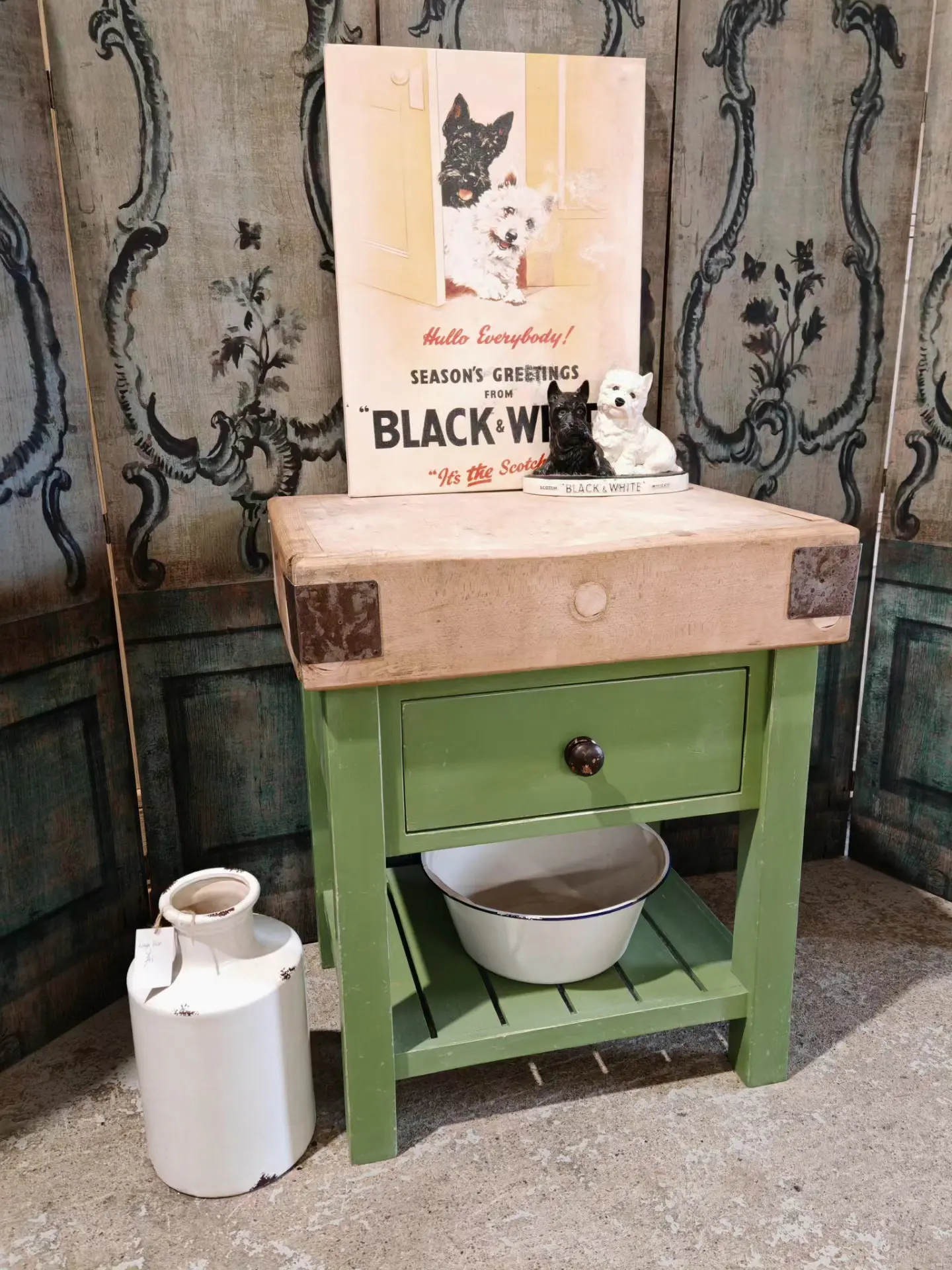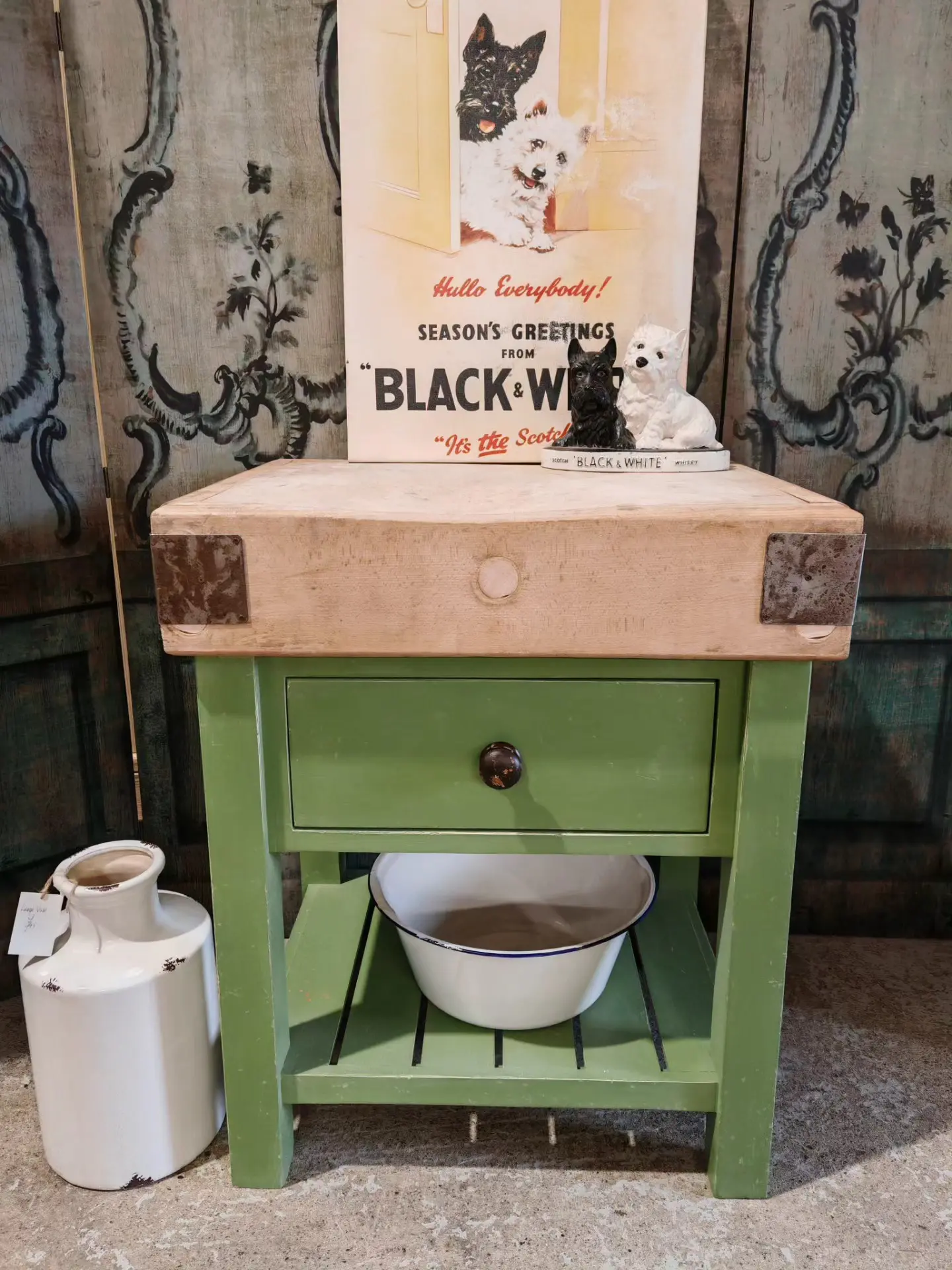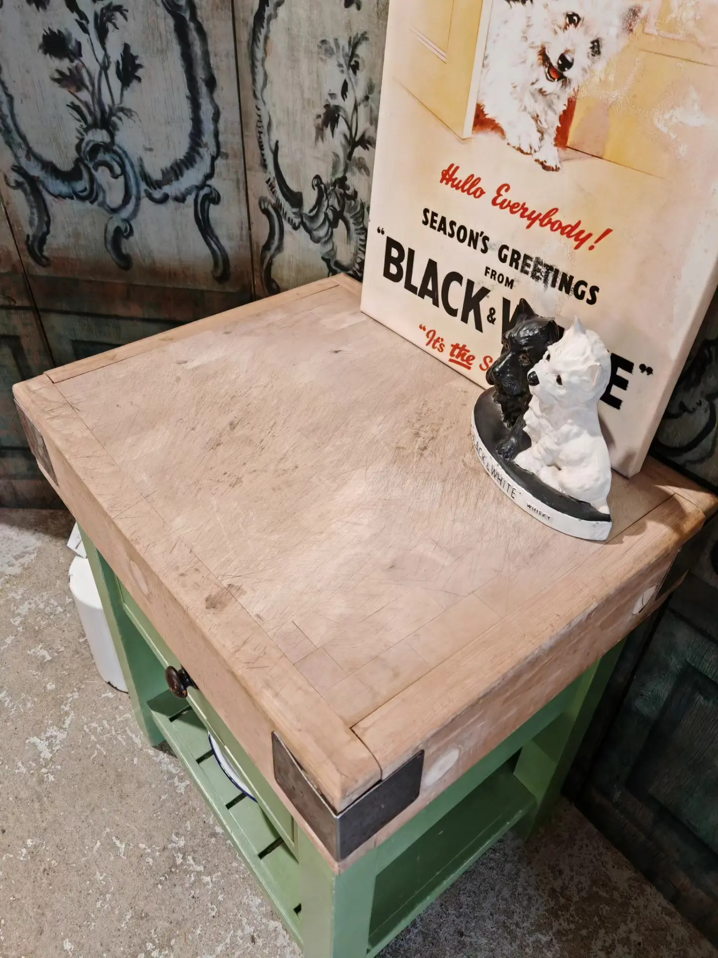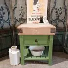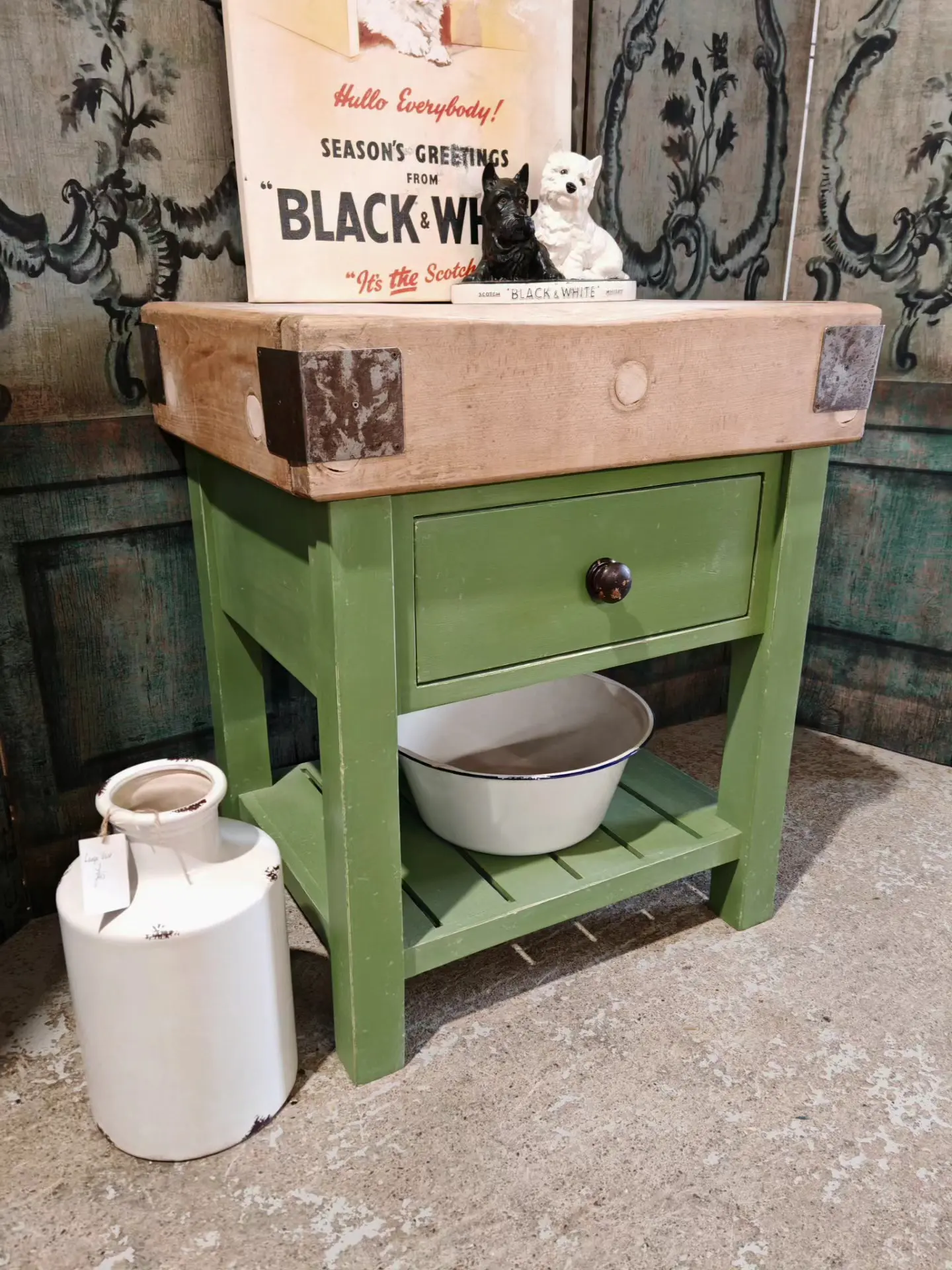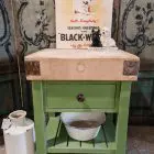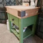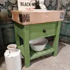 This stunning butchers block sits handsomely on its green painted and distressed base.