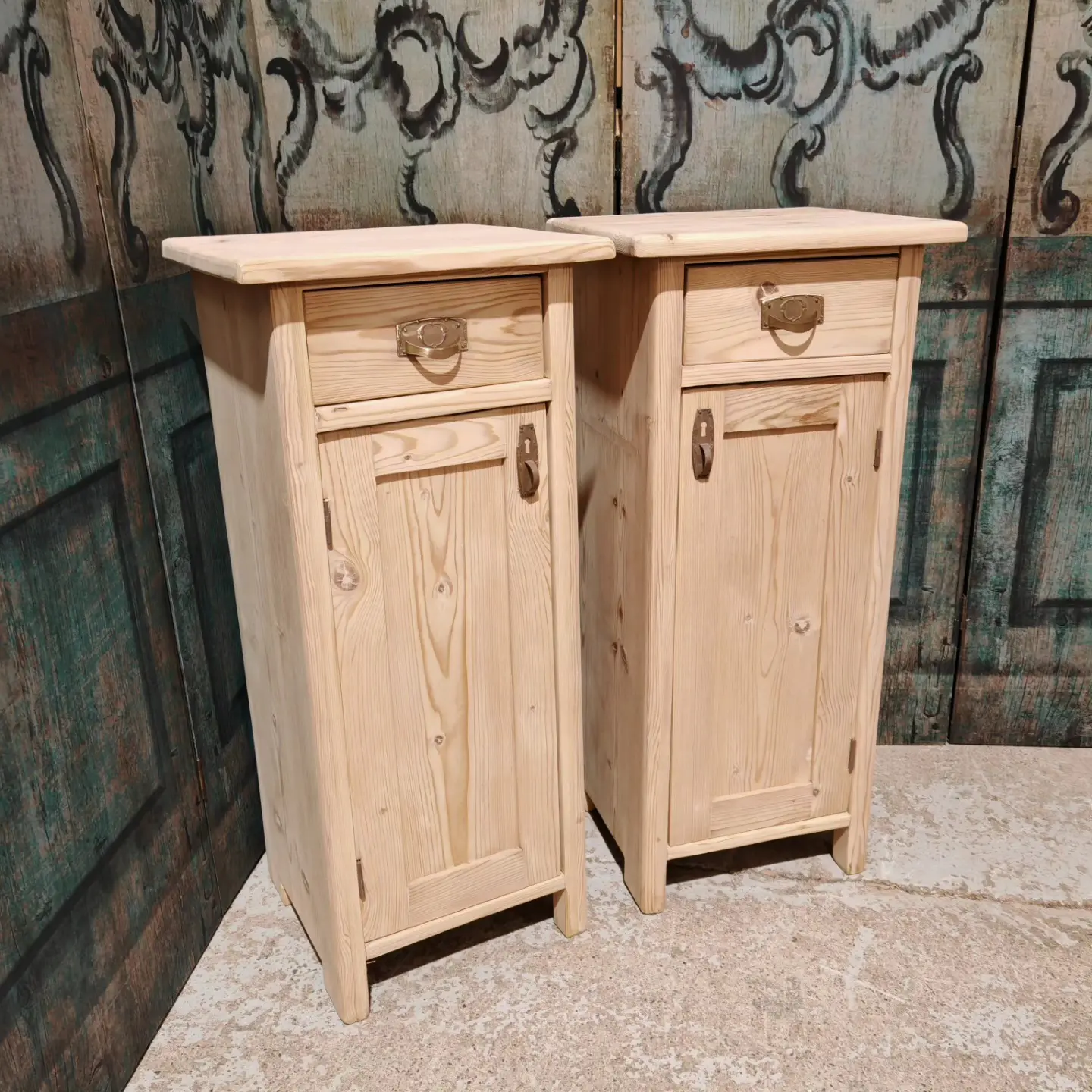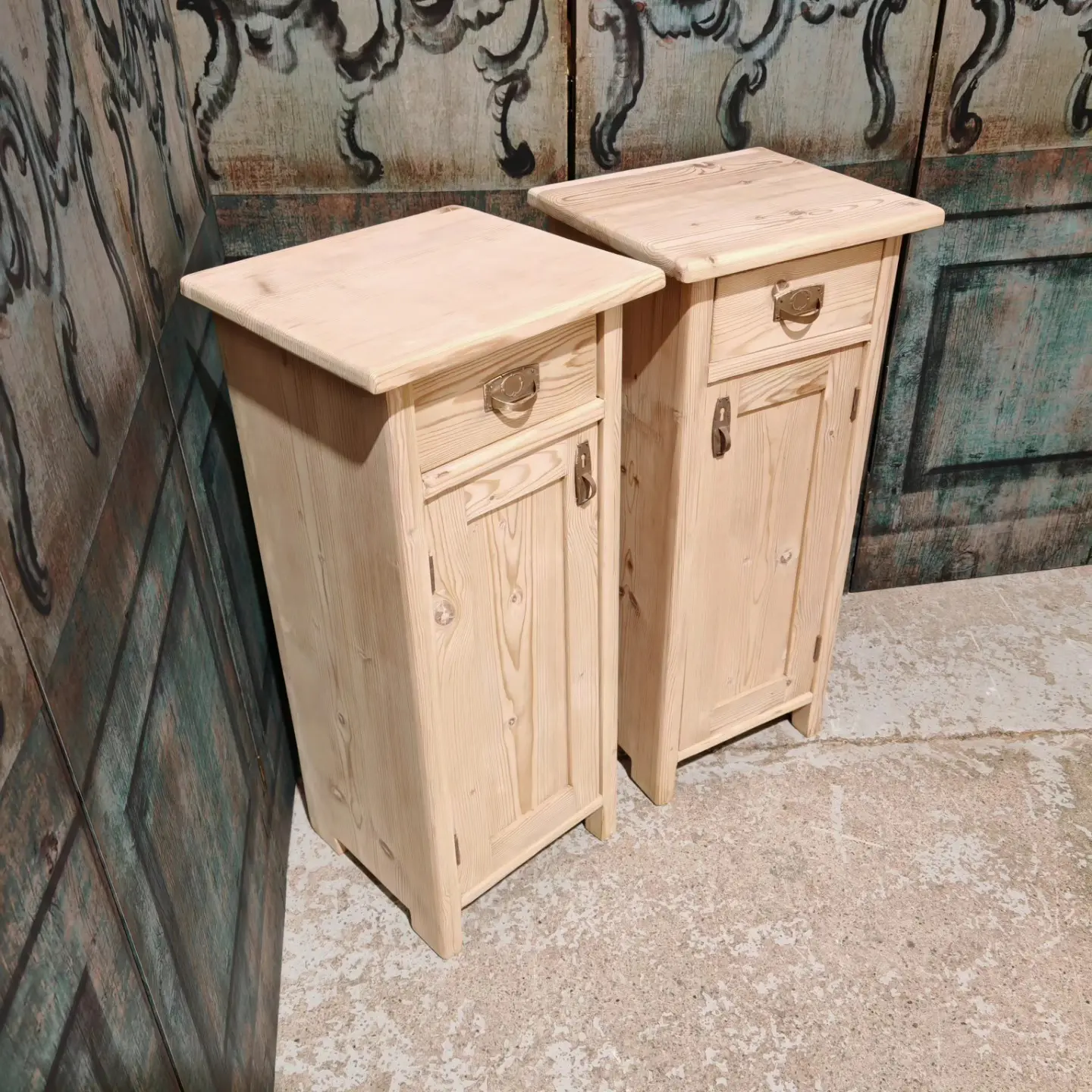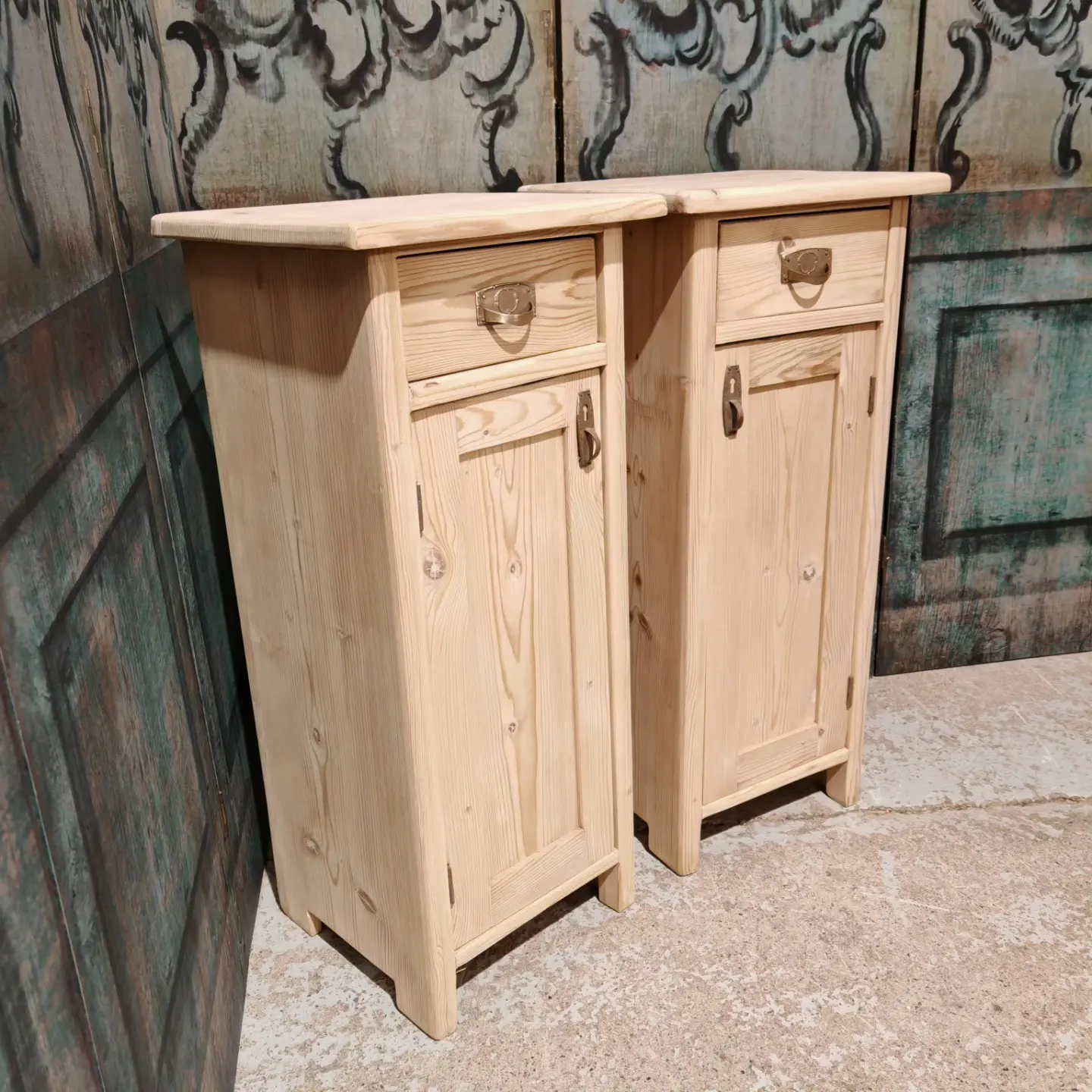 A pair of antique pine Eastern European narrow bedside cabinets
