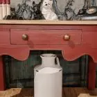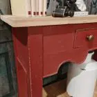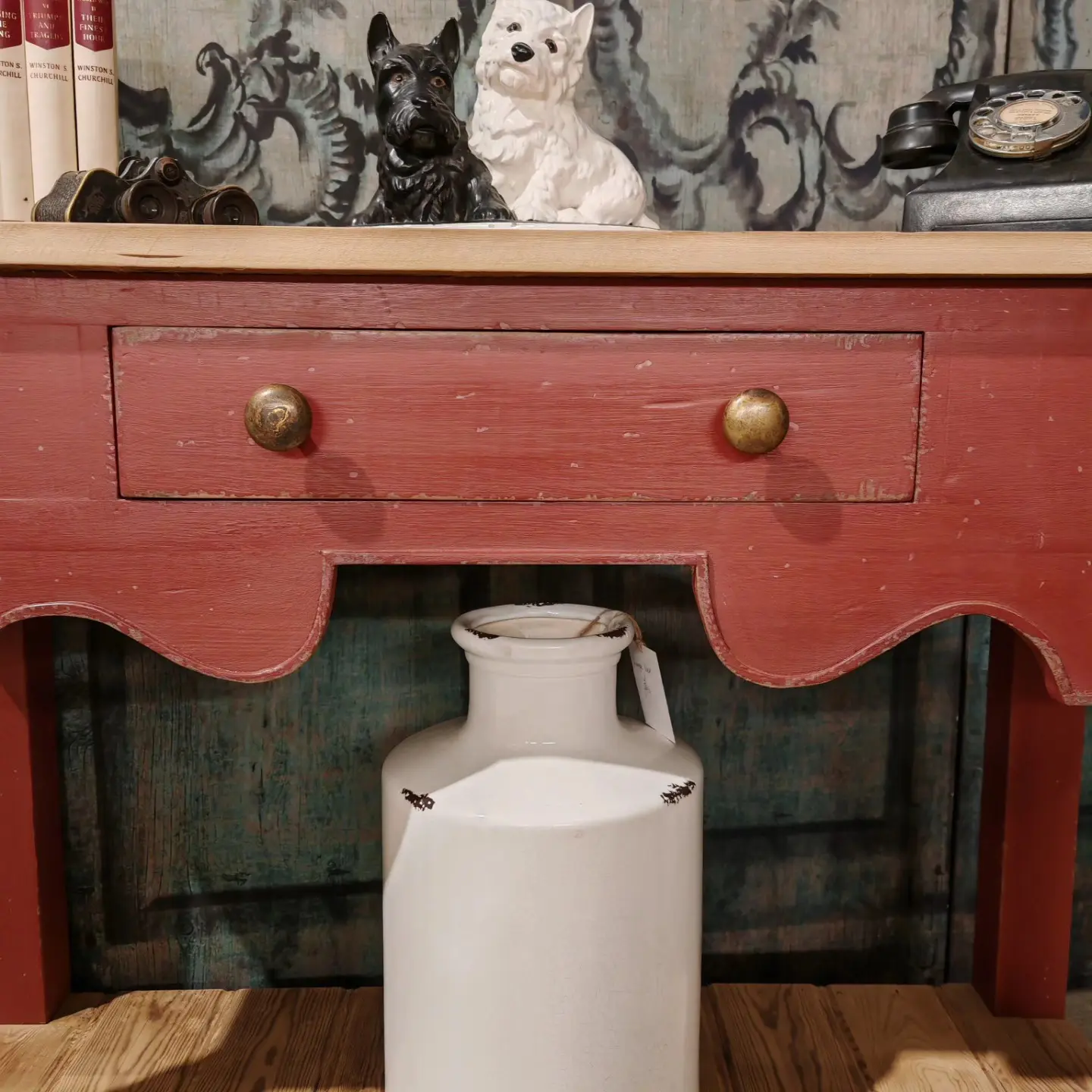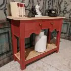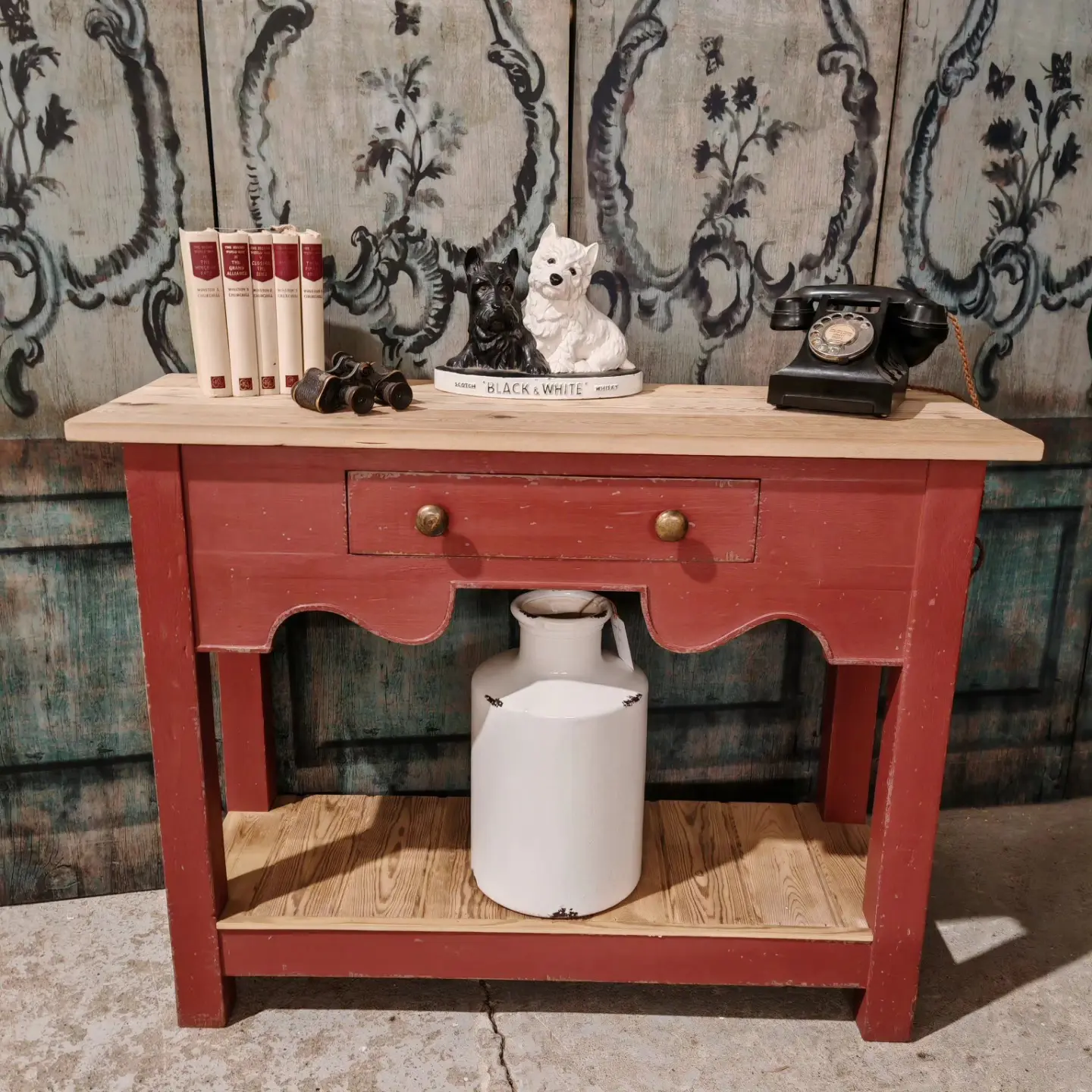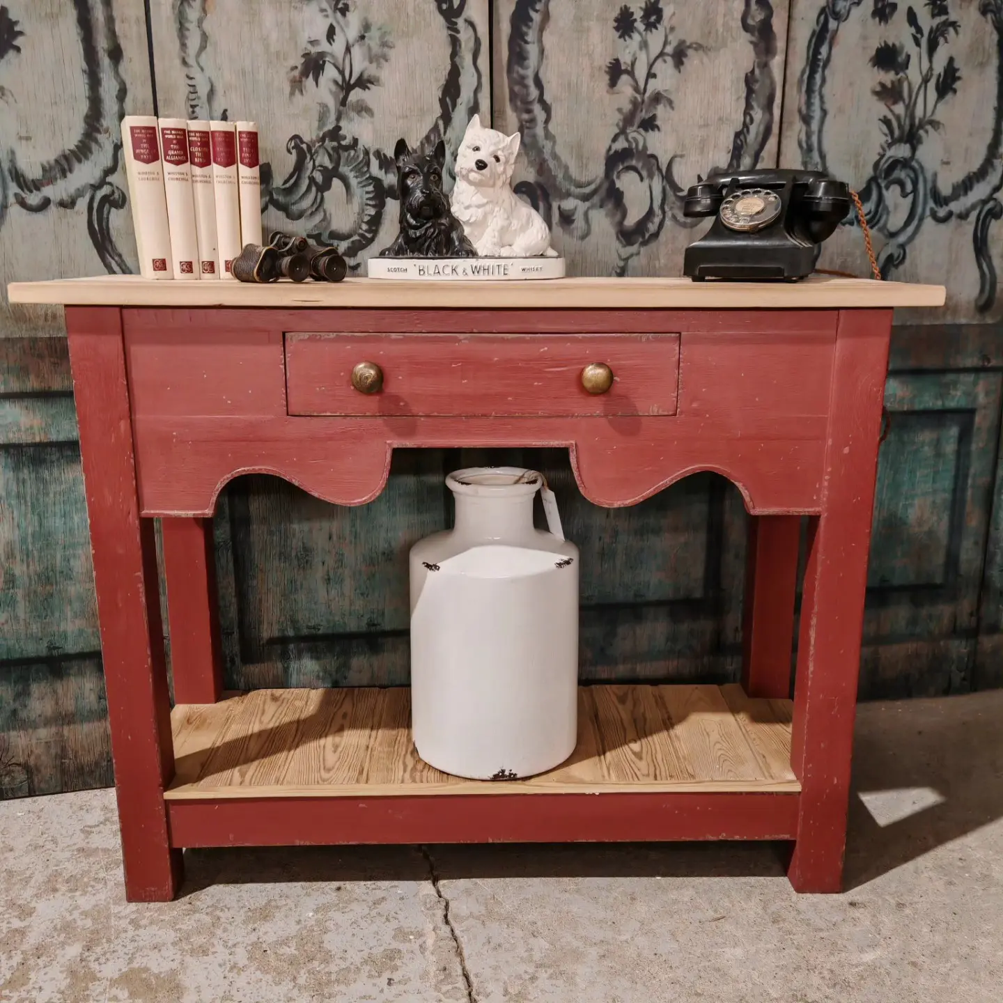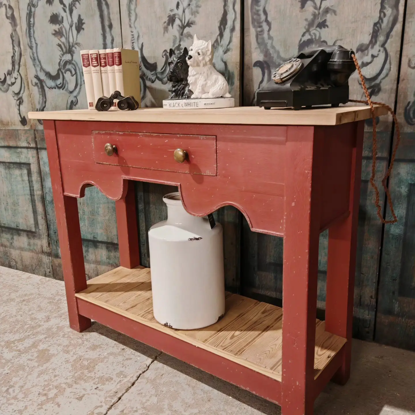 We have a beautiful handmade console / lamp table painted and distressed in Farrow and Ball’s Eating room red .