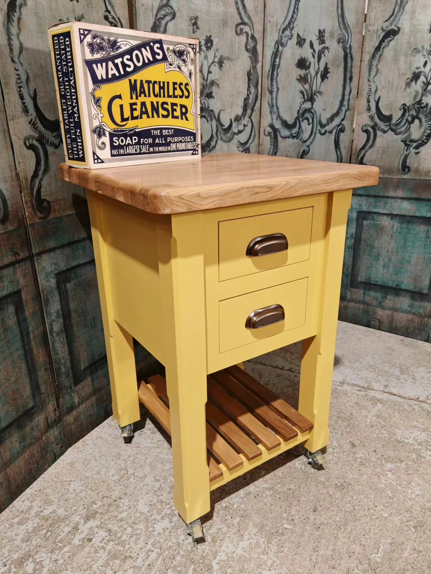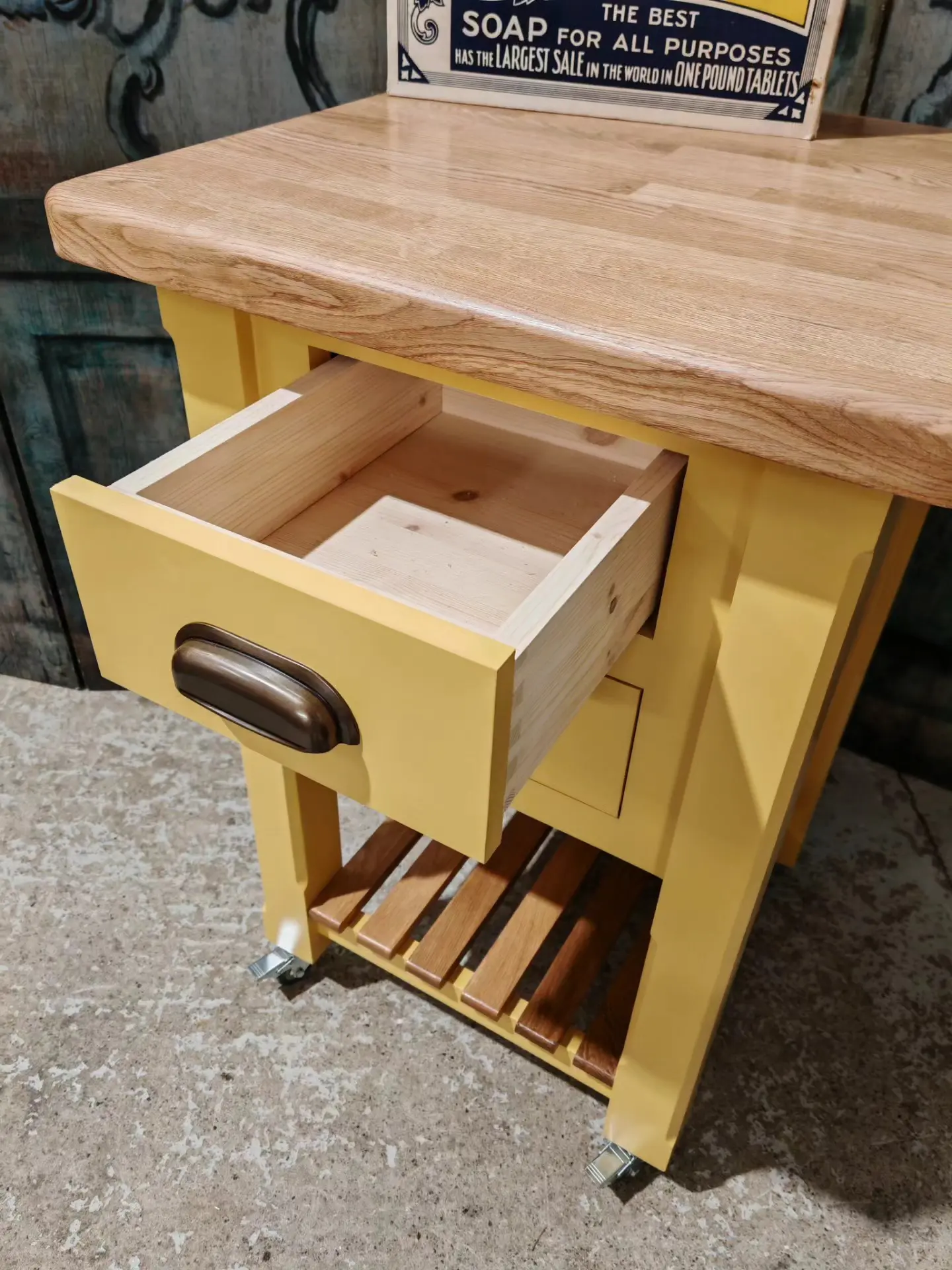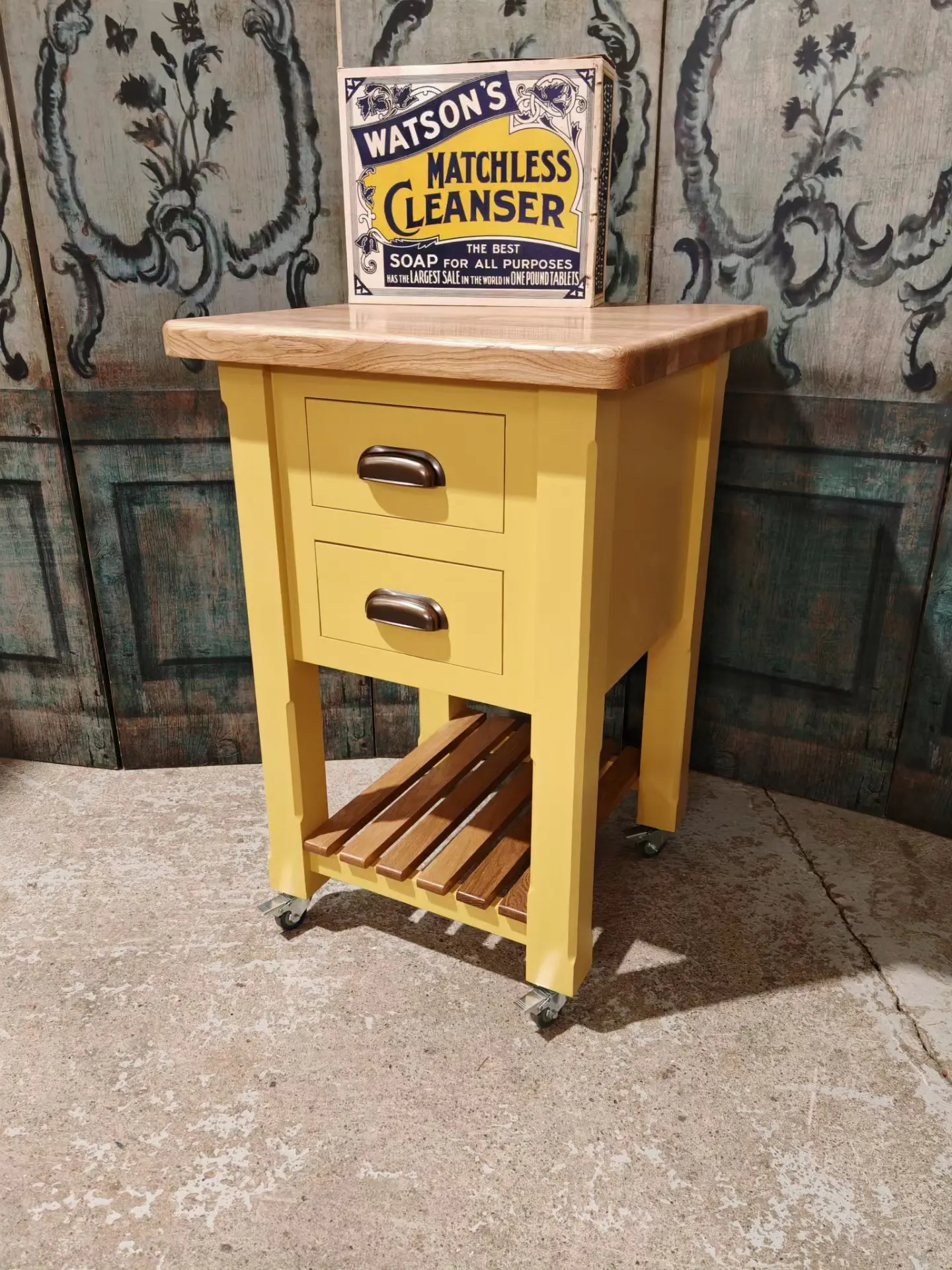 Finished in a soft yellow with a solid oak 40mm thick wood worktop, this piece perfectly balances rustic warmth with classic elegance and a good brave standalone colour.