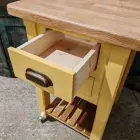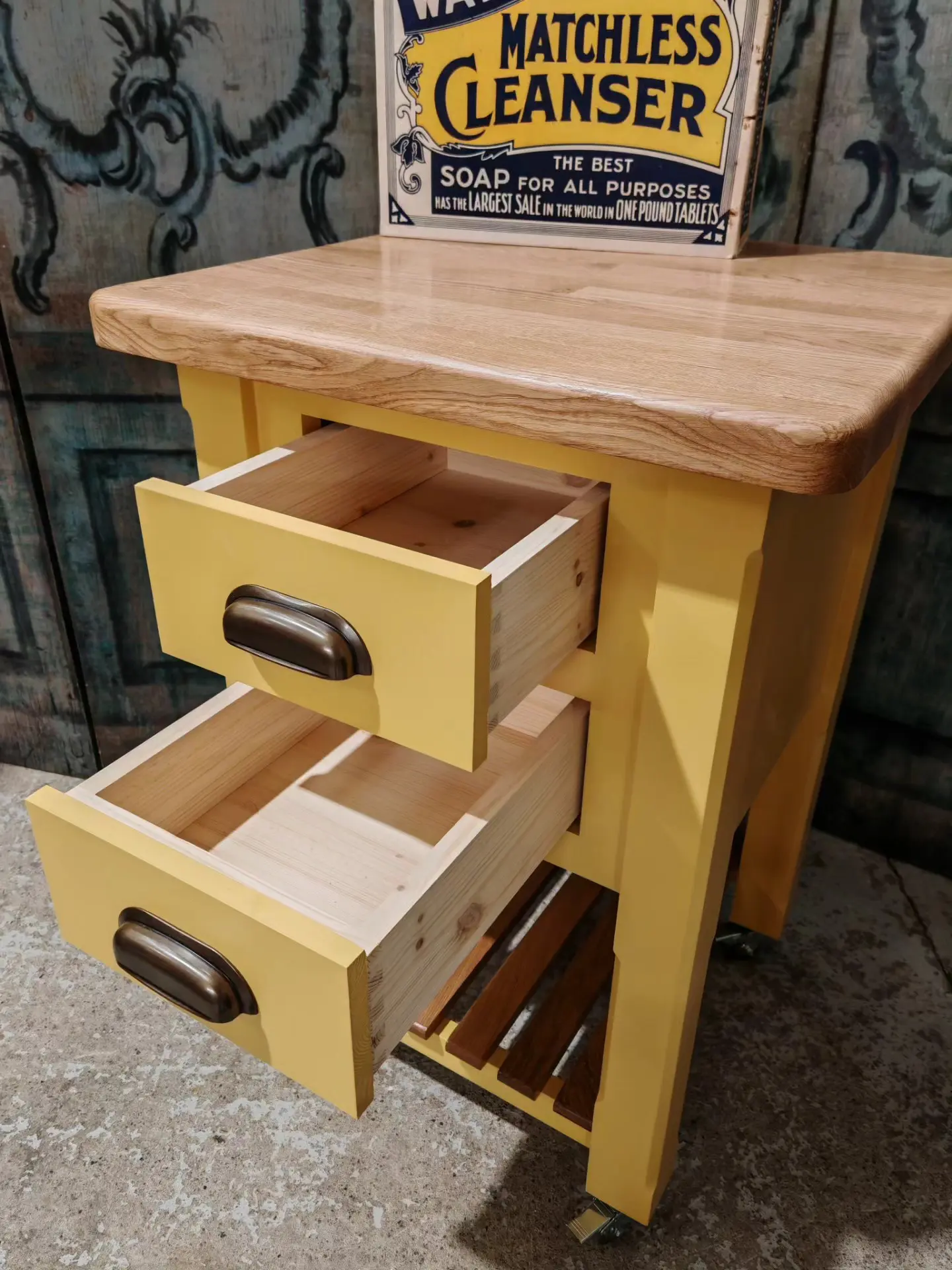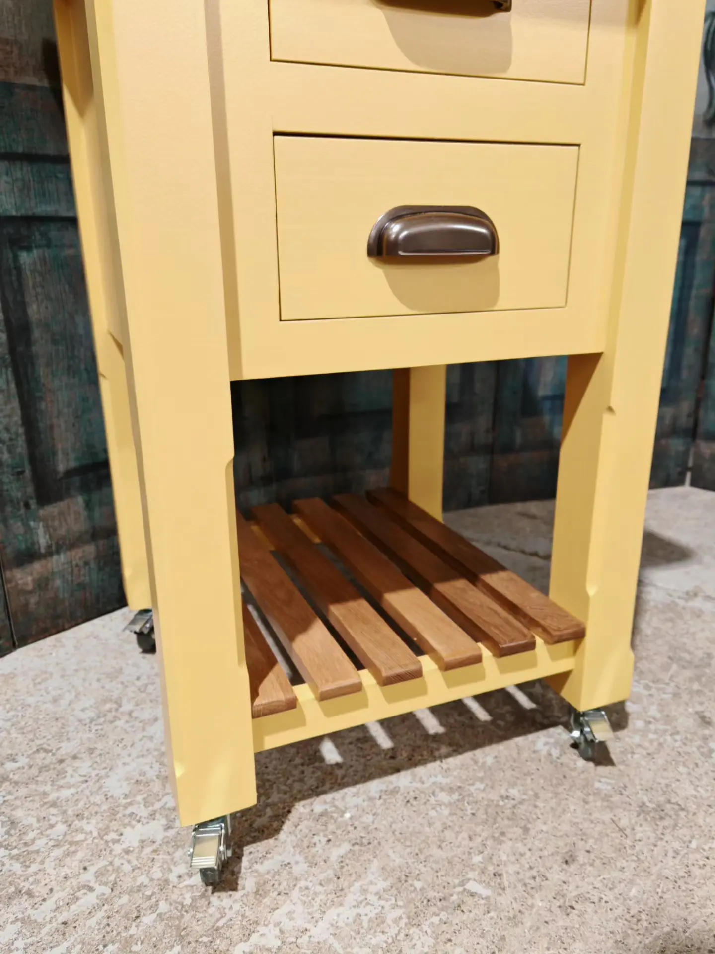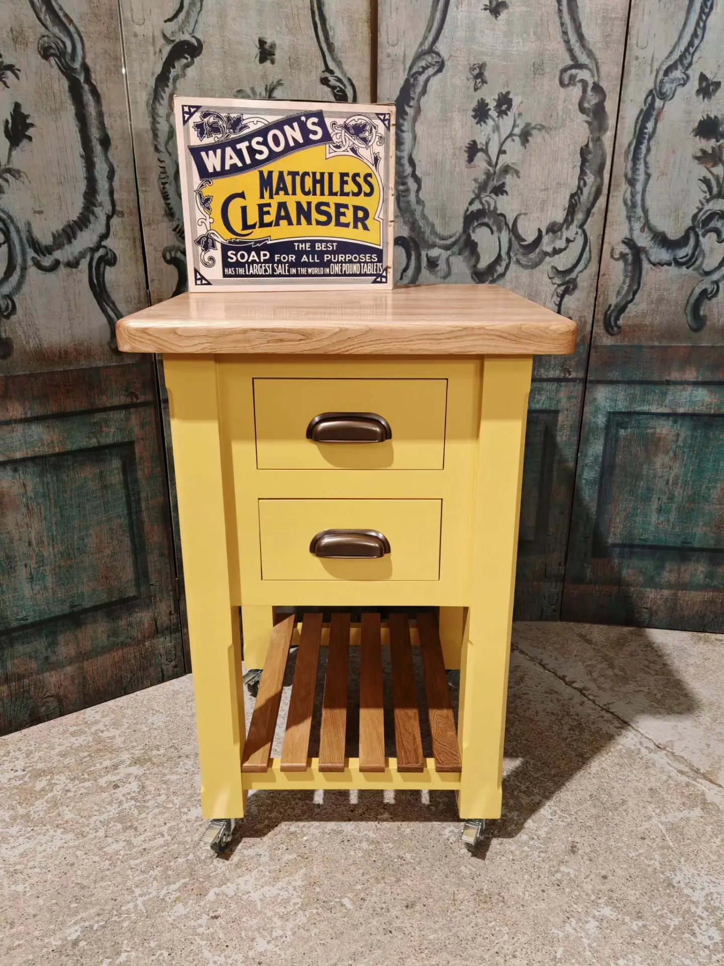 Finished in a soft yellow with a solid oak 40mm thick wood worktop, this piece perfectly balances rustic warmth with classic elegance and a good brave standalone colour.
