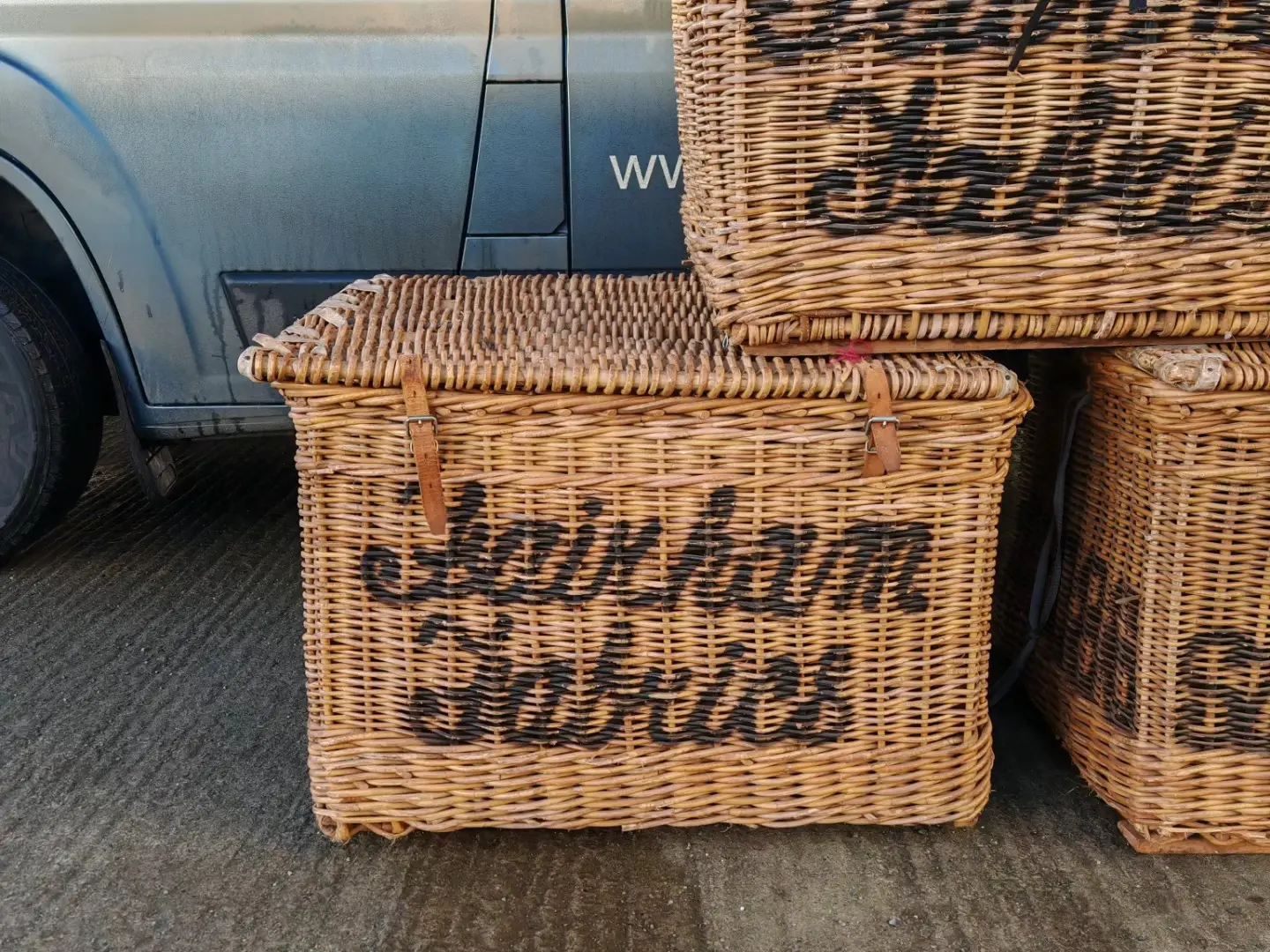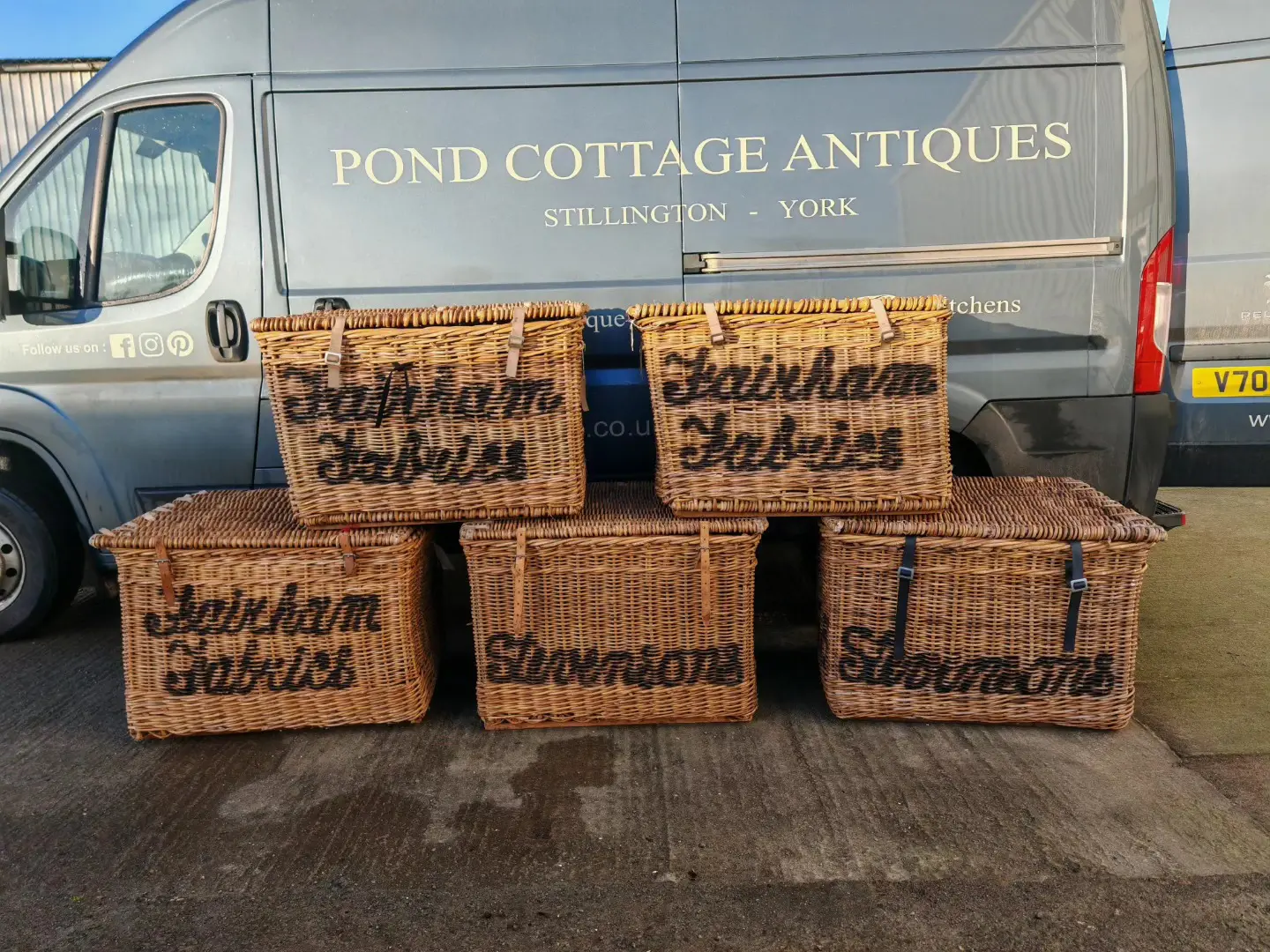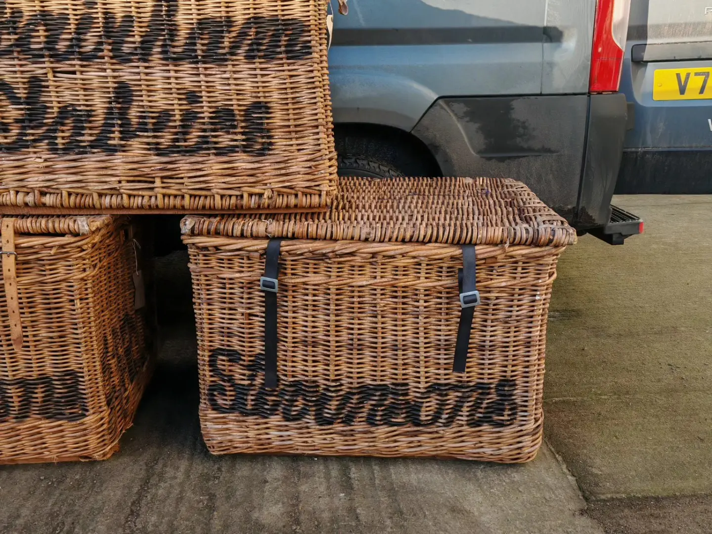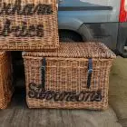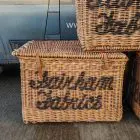 These stunning large baskets were originally used in a mill and each one varies very slightly in size and with the lettering on the front and sides. Stamped with their original mill markings