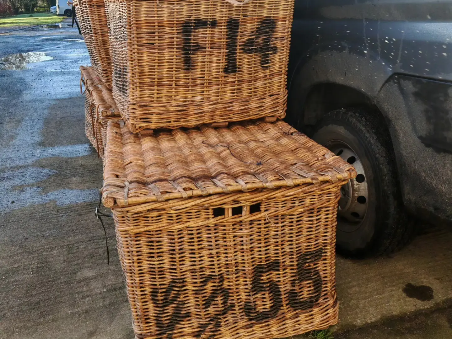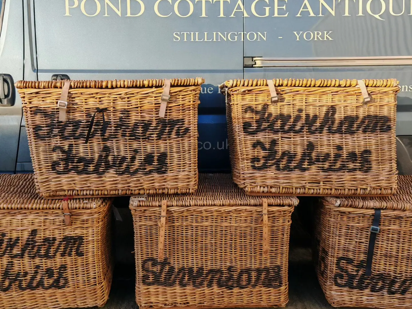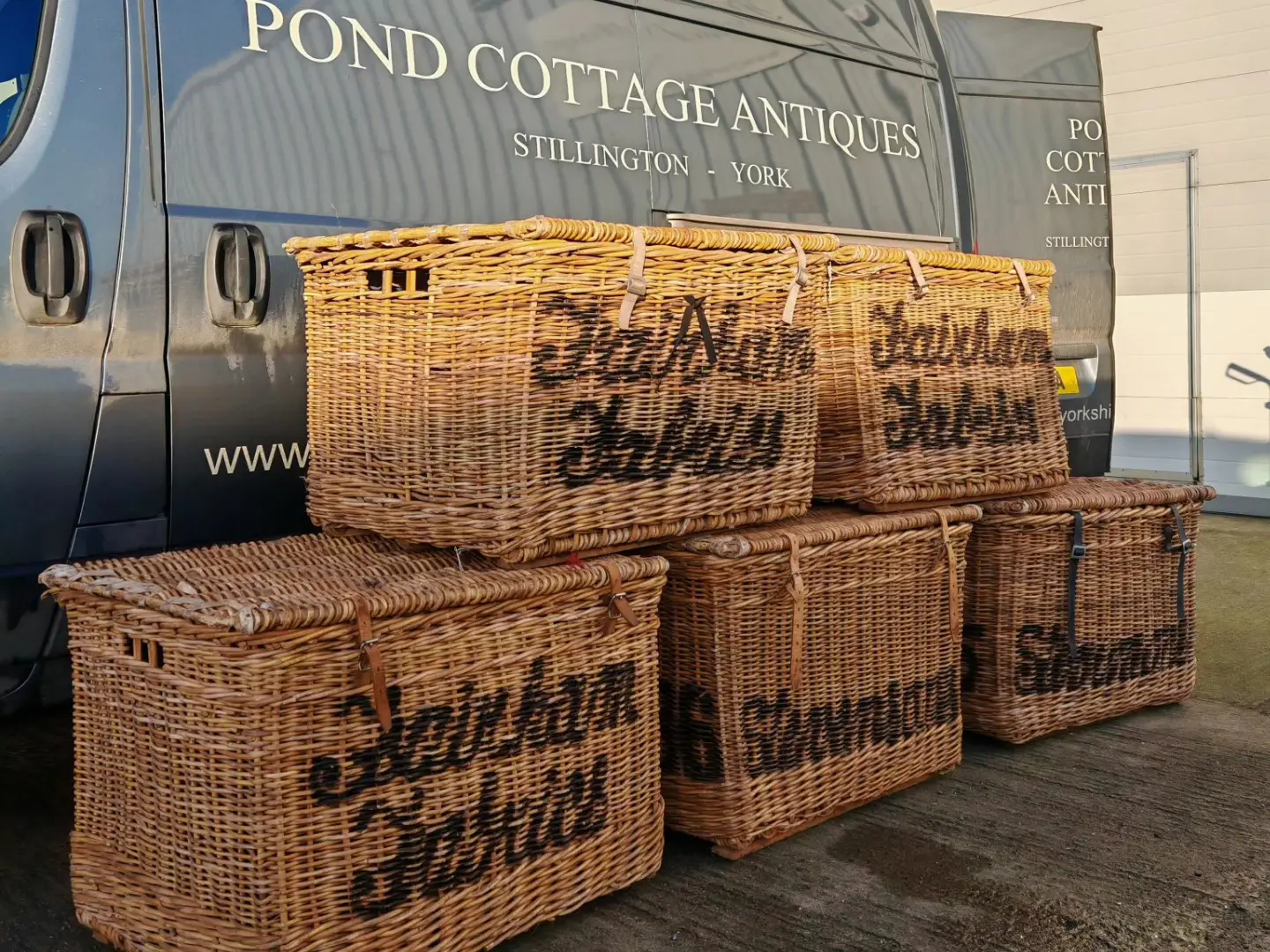 These stunning large baskets were originally used in a mill and each one varies very slightly in size and with the lettering on the front and sides. Stamped with their original mill markings