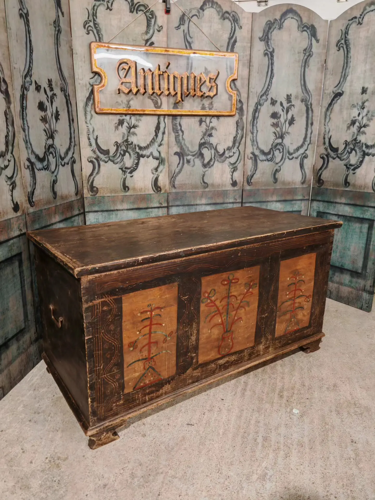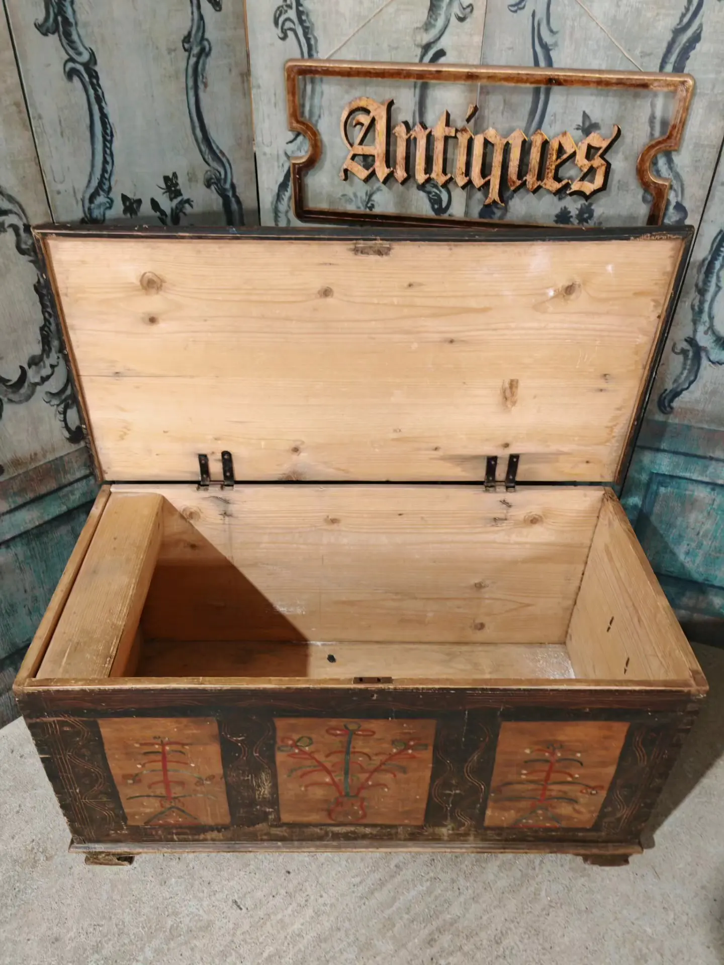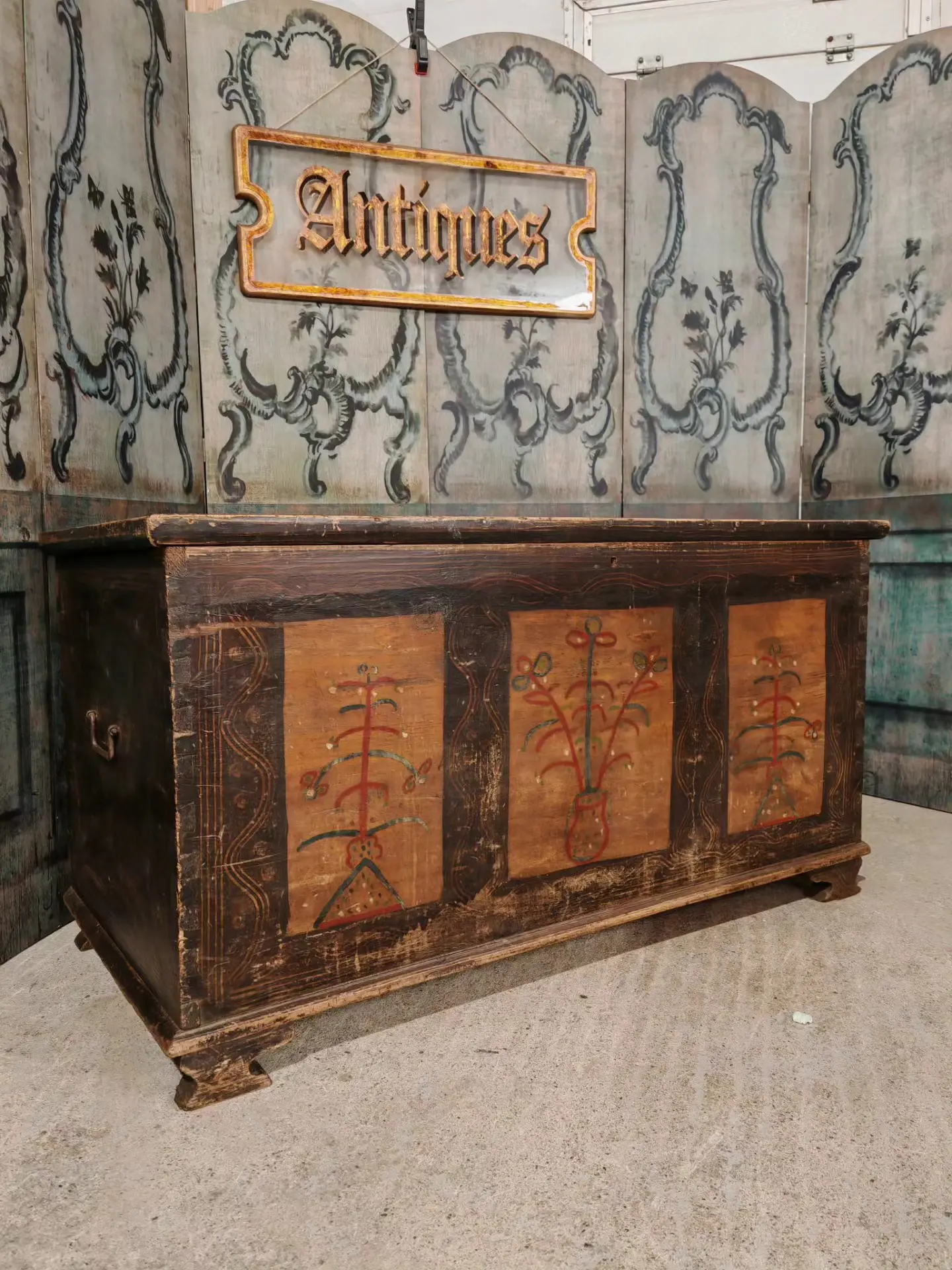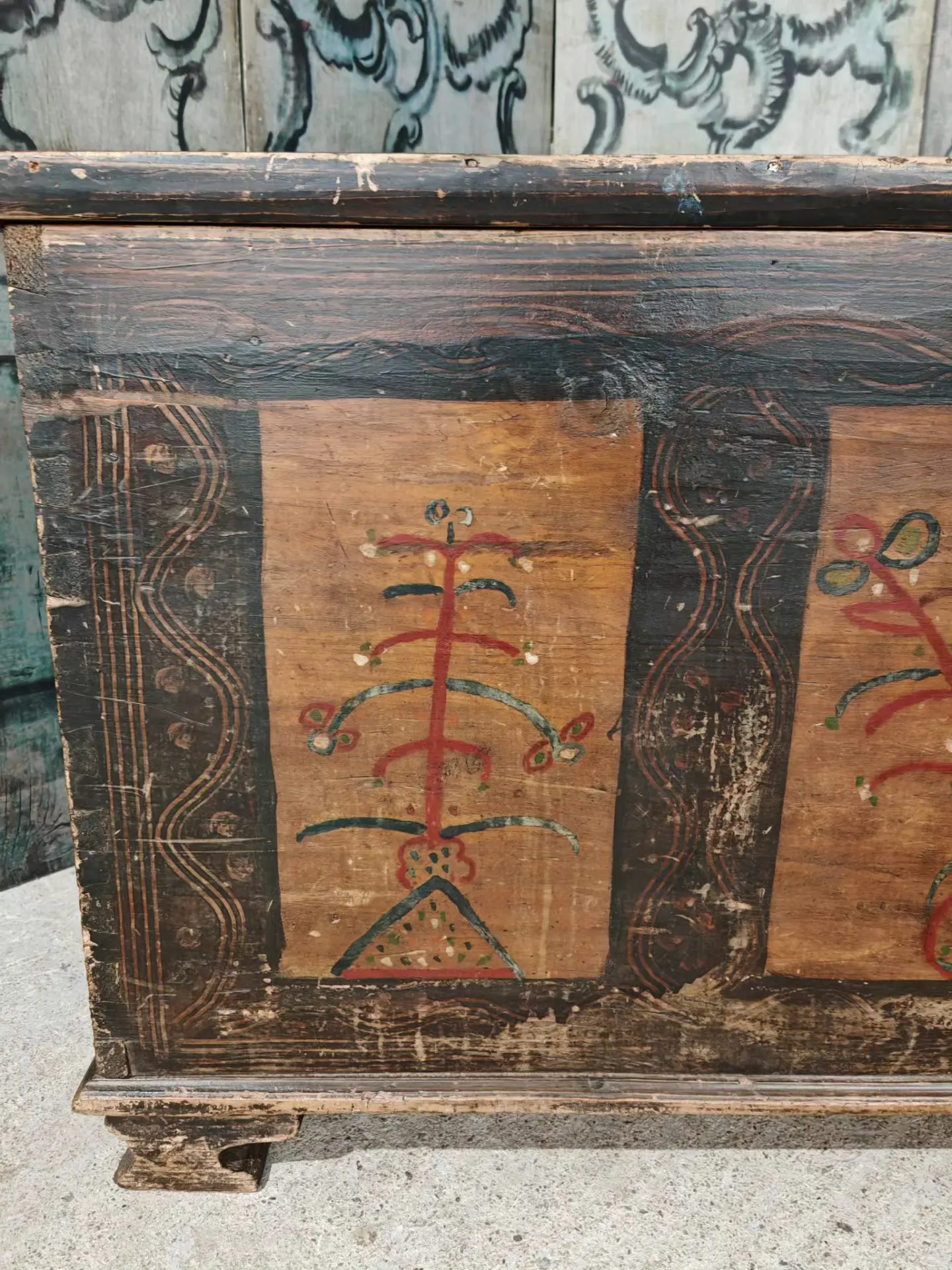 This is an antique painted blanket chest, also known as a marriage chest or hope chest. It is a piece of folk art furniture, likely of Central European or Scandinavian origin, possibly from the 19th century.