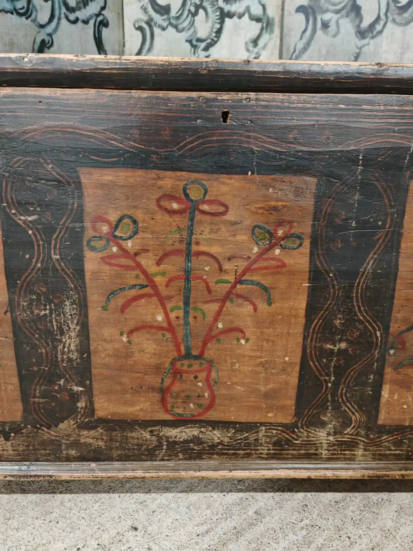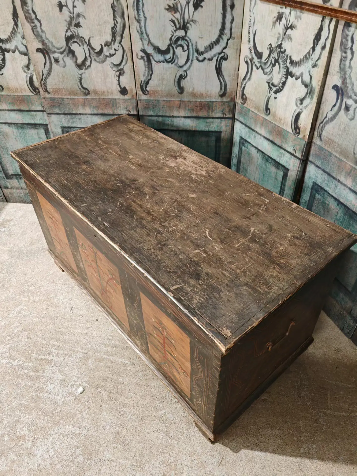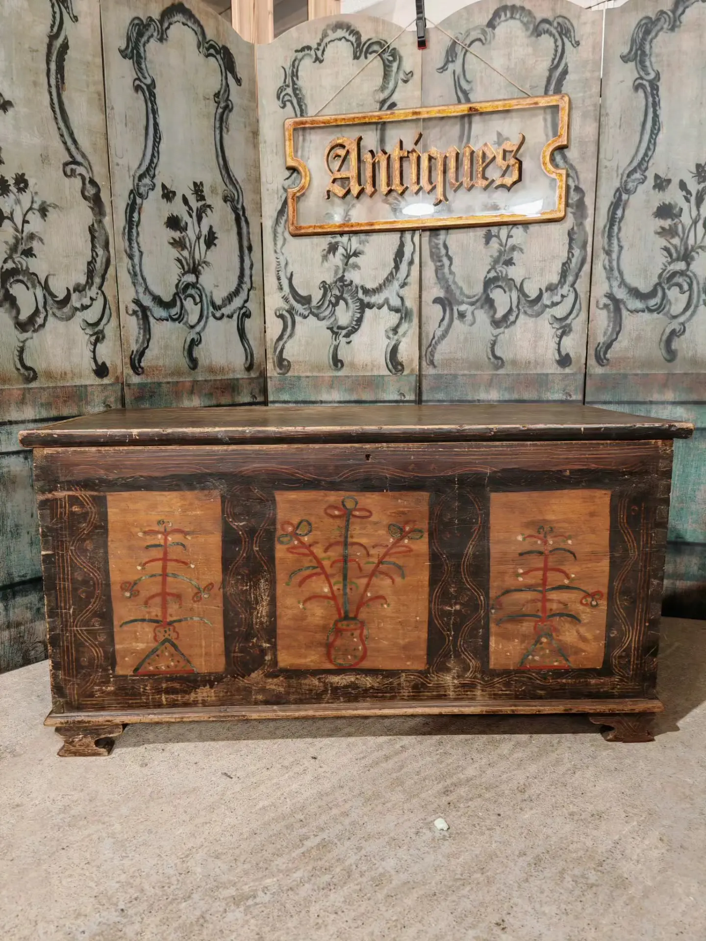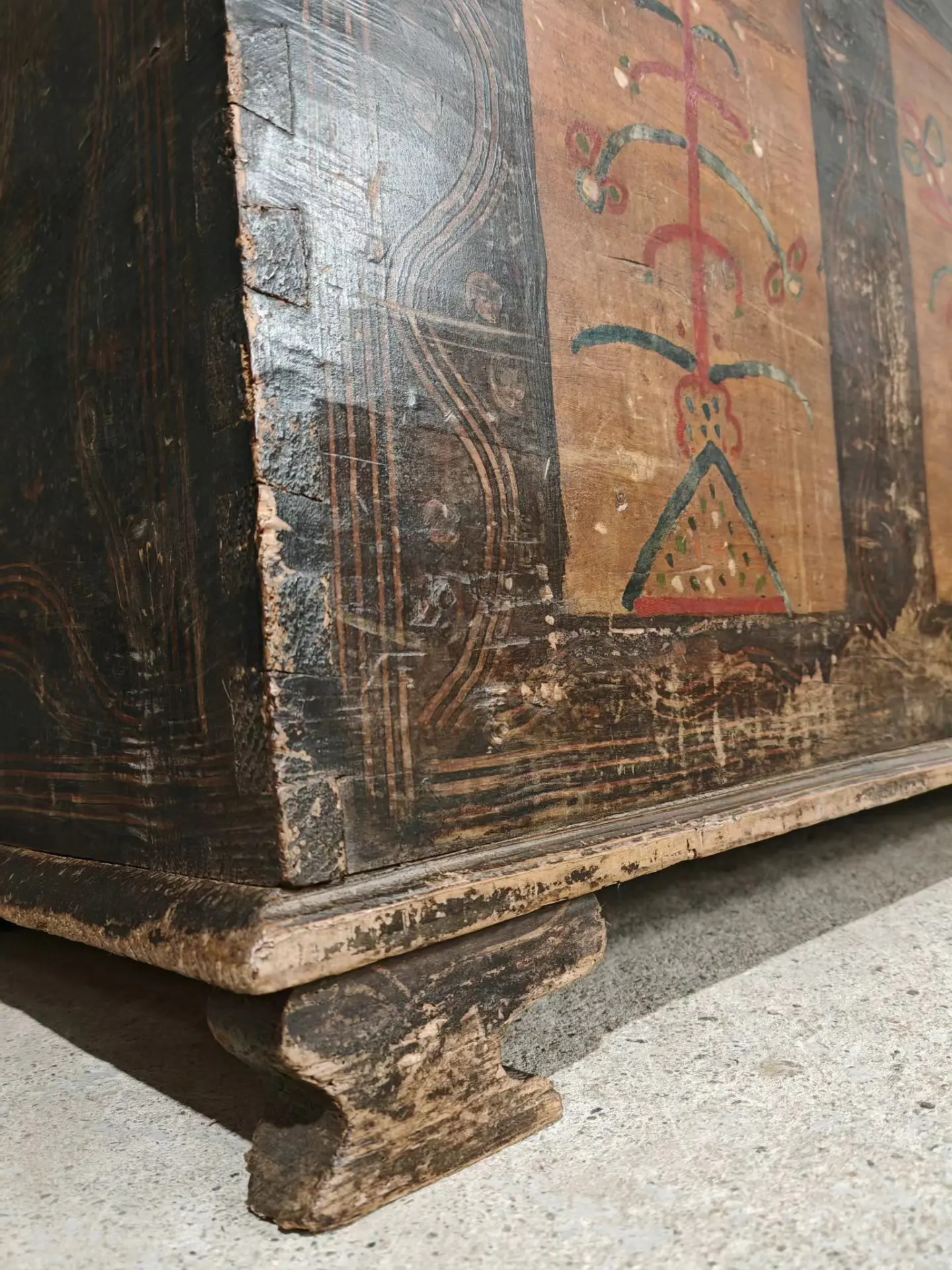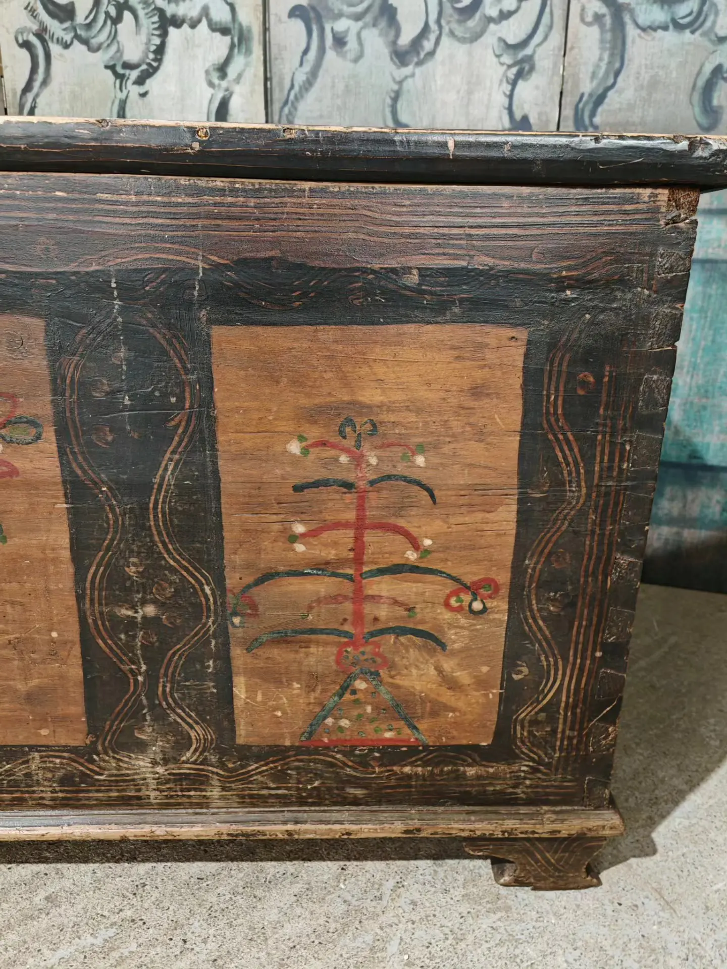 This is an antique painted blanket chest, also known as a marriage chest or hope chest. It is a piece of folk art furniture, likely of Central European or Scandinavian origin, possibly from the 19th century.
