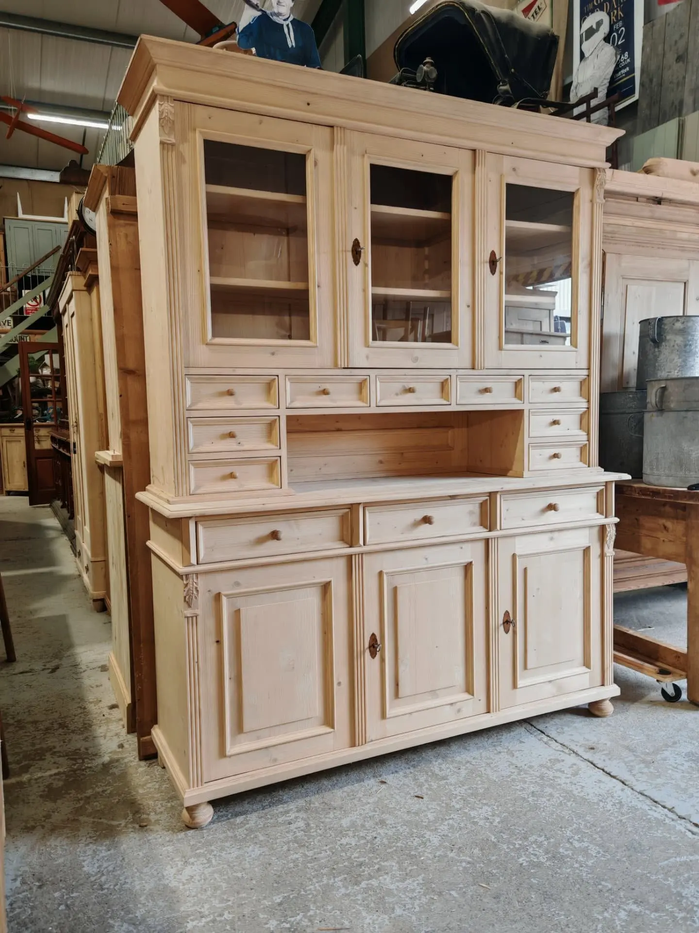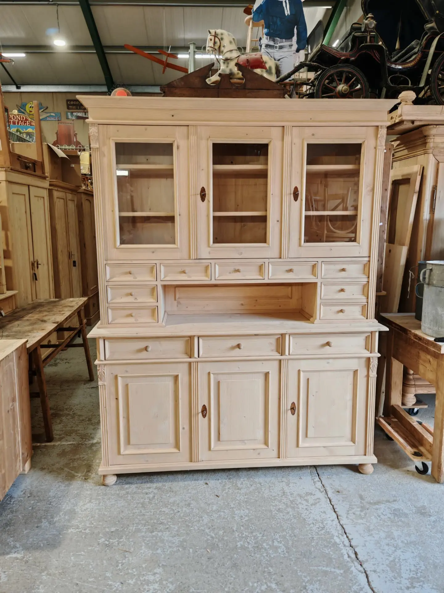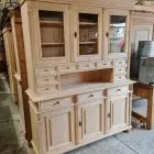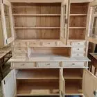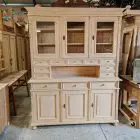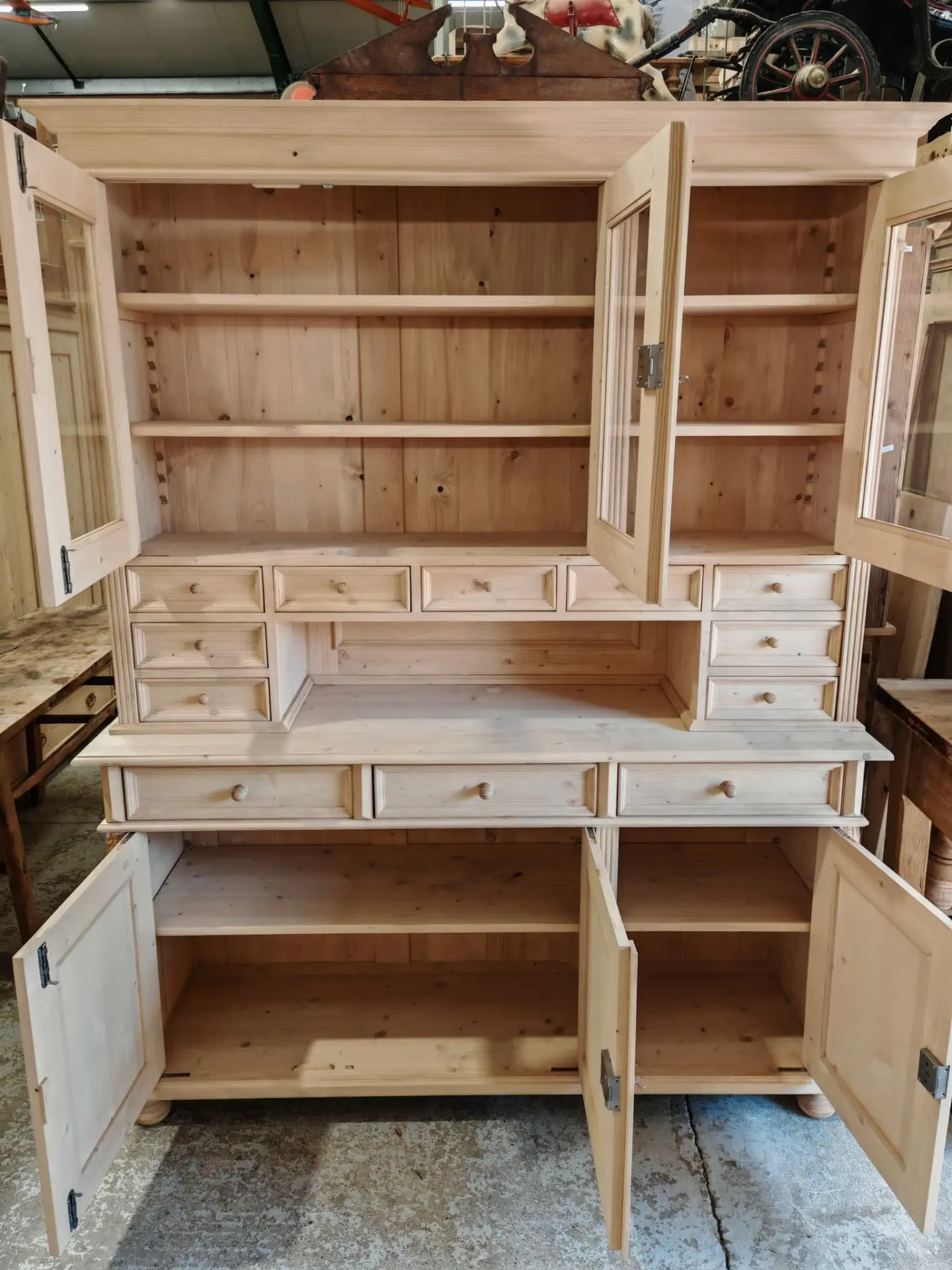 Sitting on bun turned feet and heading upwards it has 3 doors with adjustable shelves, 3 good size drawers leading to 9 spice drawers and glazed top section and shaped cornice.