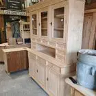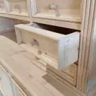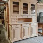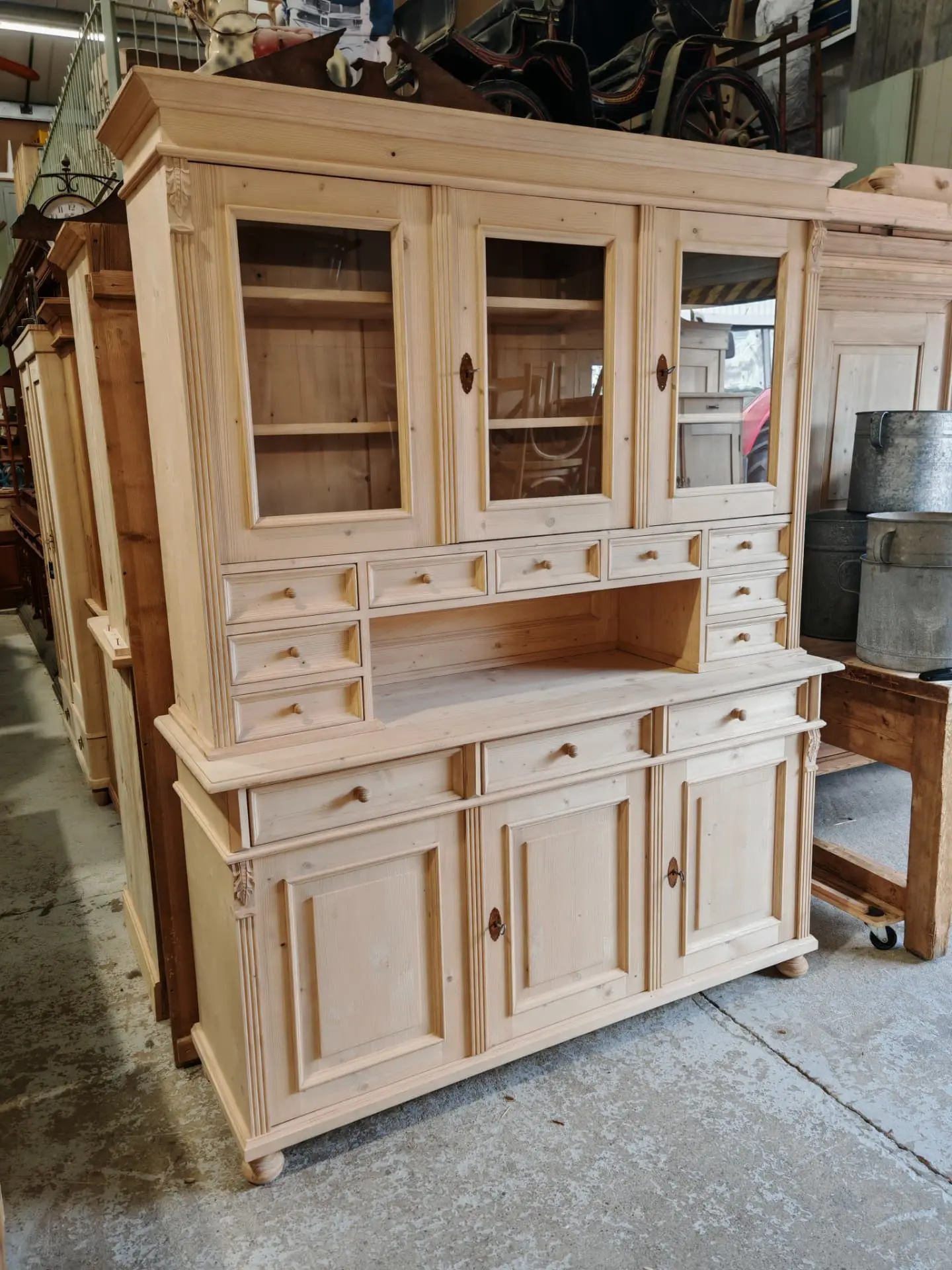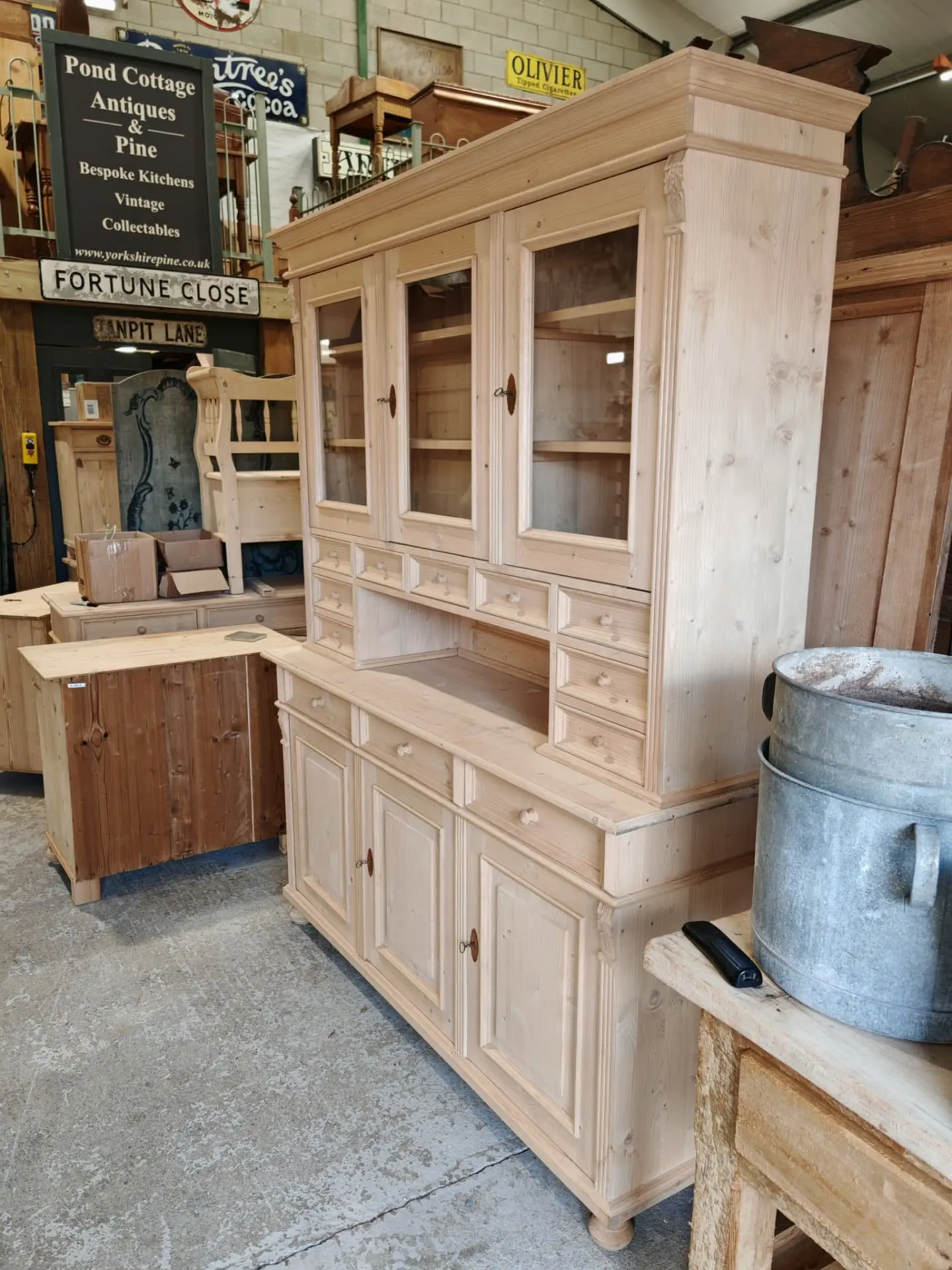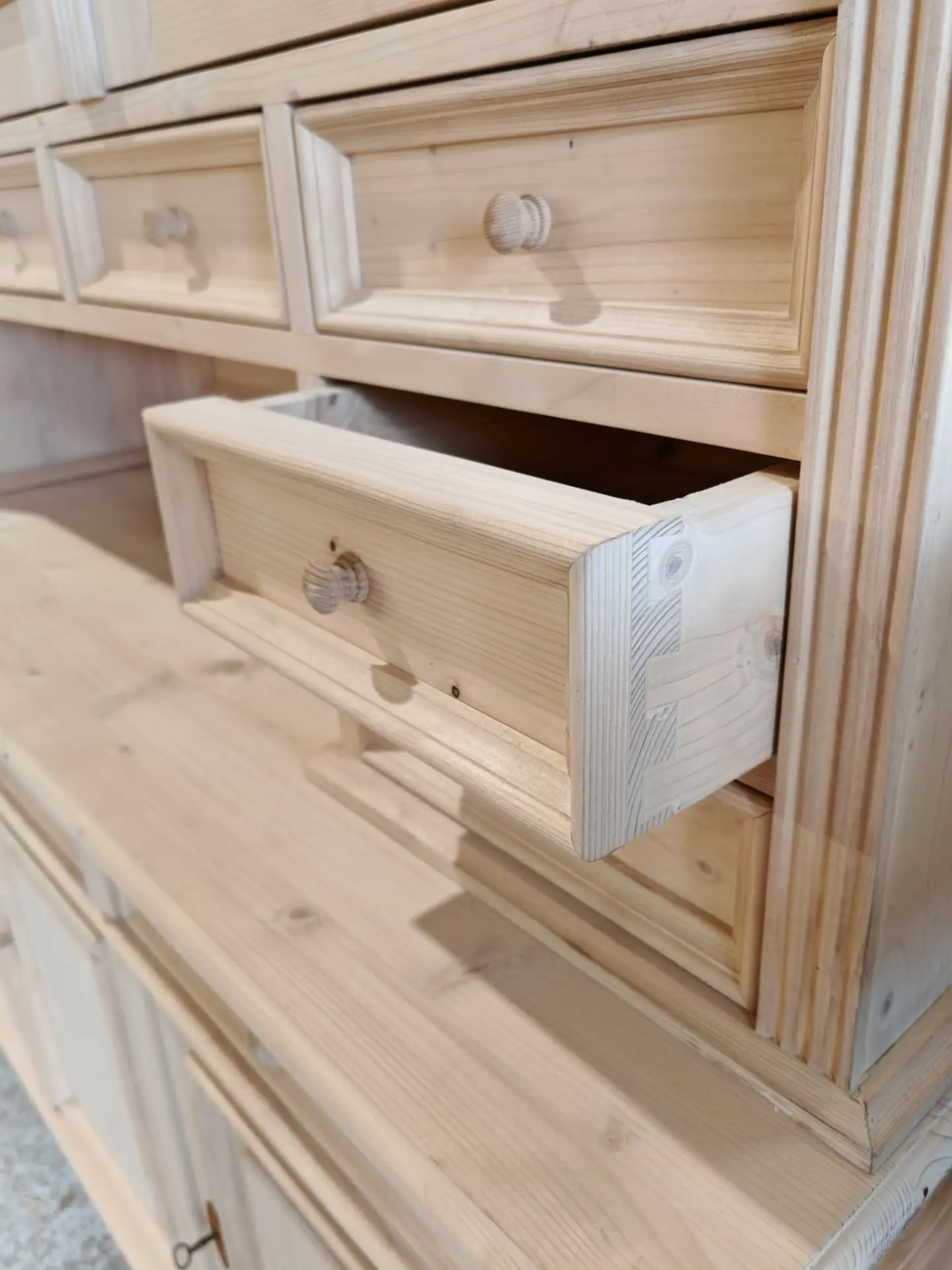 Sitting on bun turned feet and heading upwards it has 3 doors with adjustable shelves, 3 good size drawers leading to 9 spice drawers and glazed top section and shaped cornice.