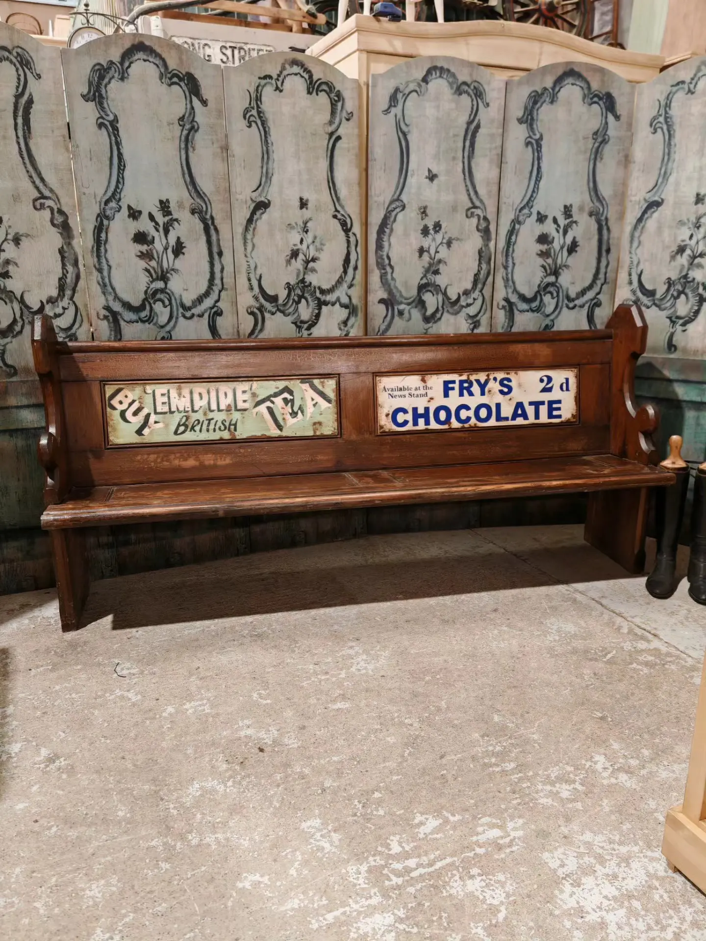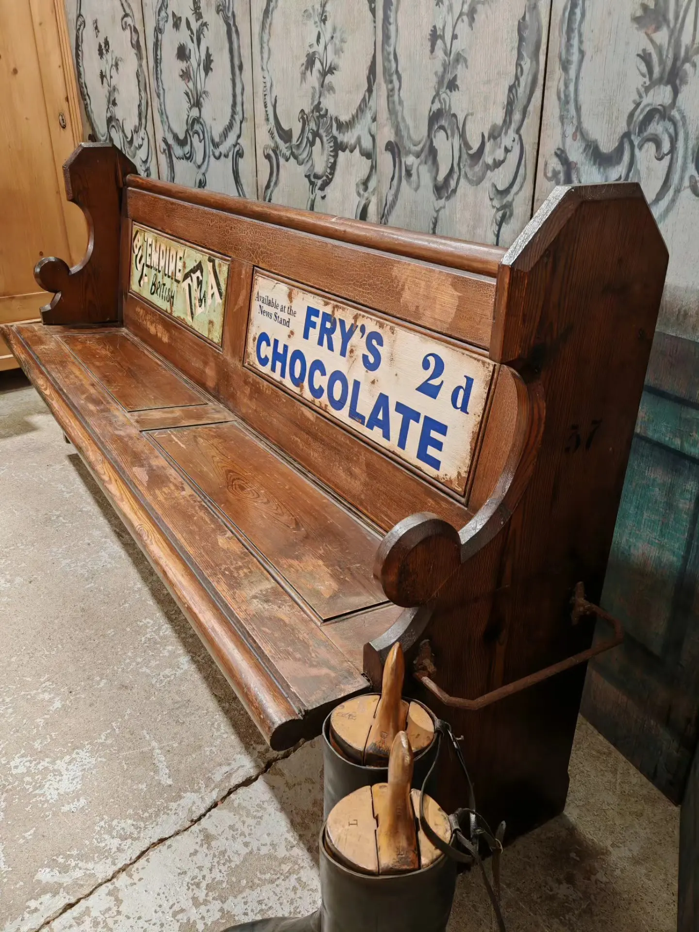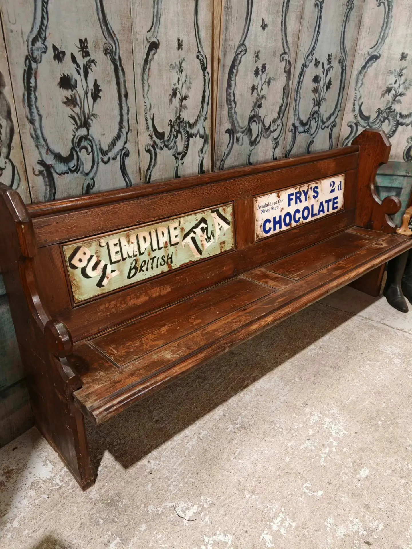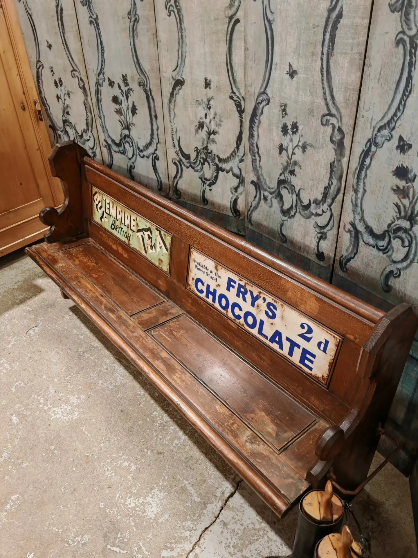 This amazing old original condition church pew is new into stock this morning and is fabulous with the old painted advertising in the back panels.