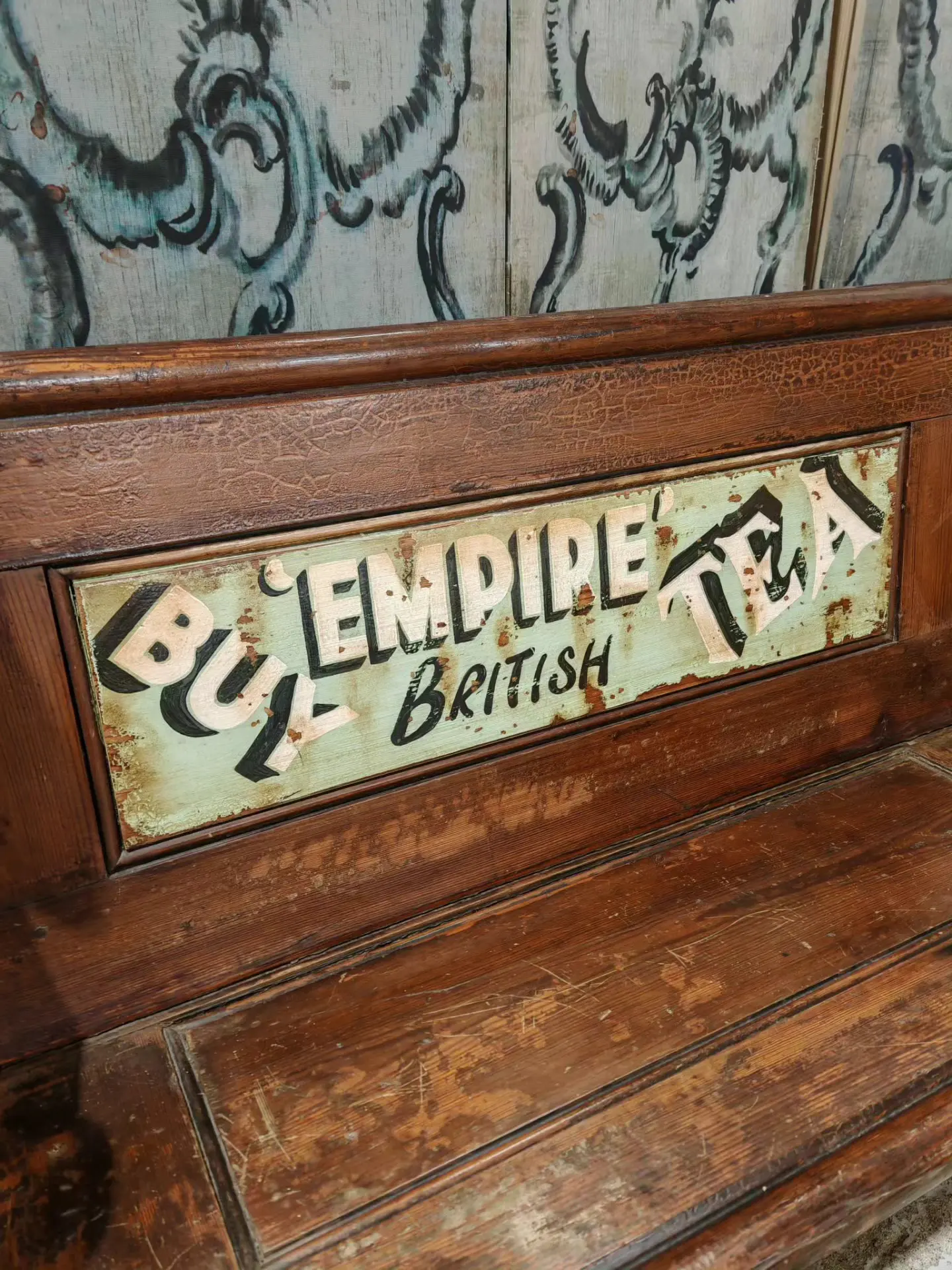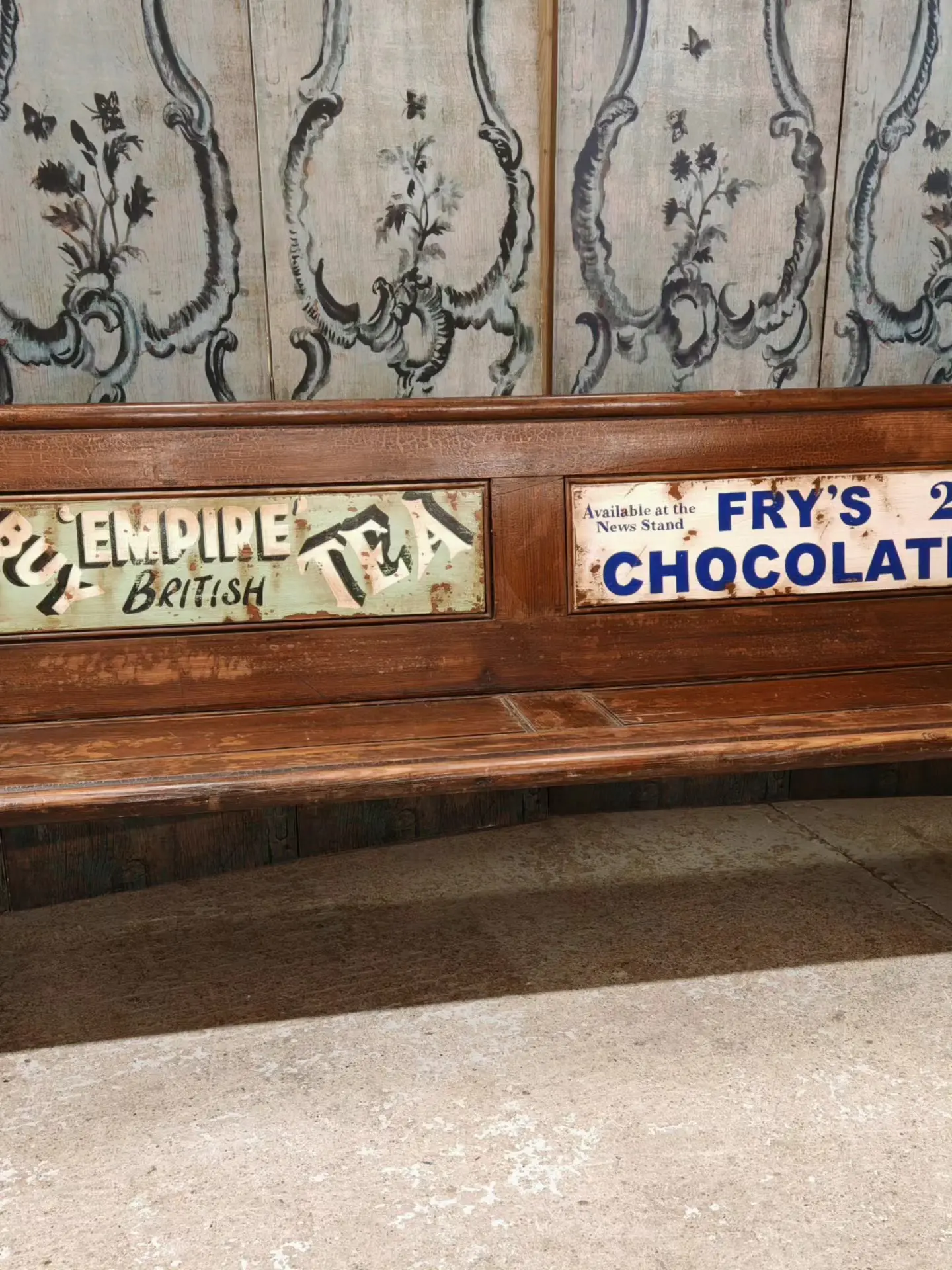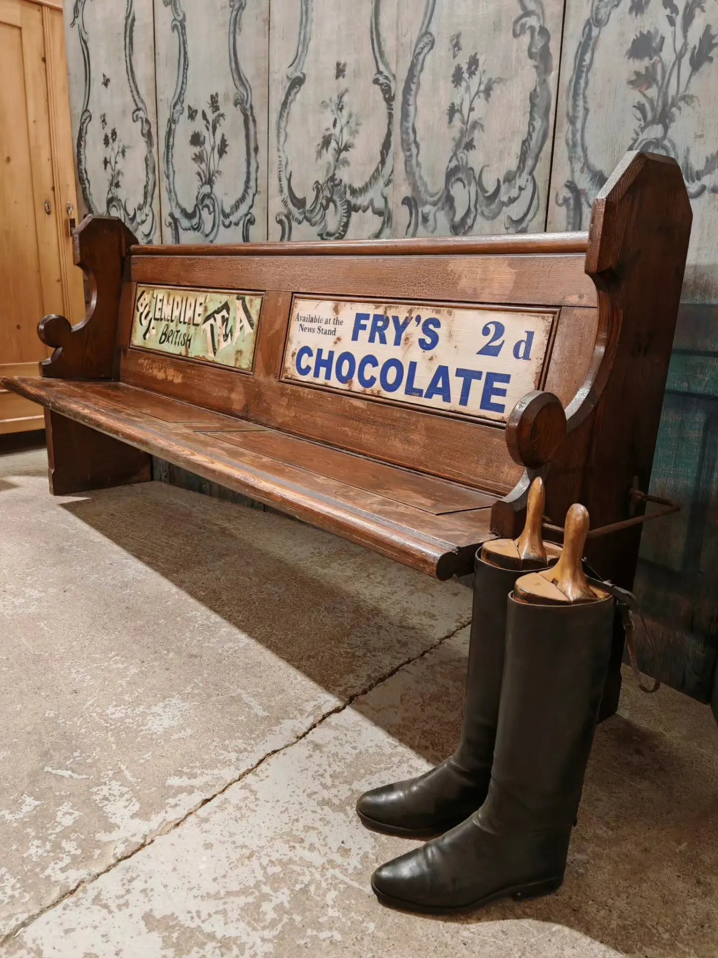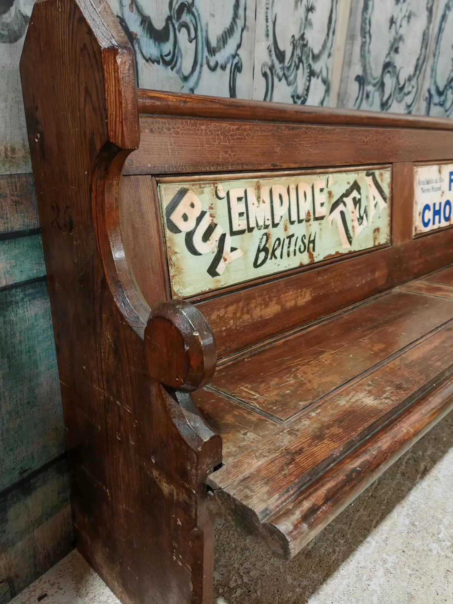 This amazing old original condition church pew is new into stock this morning and is fabulous with the old painted advertising in the back panels.