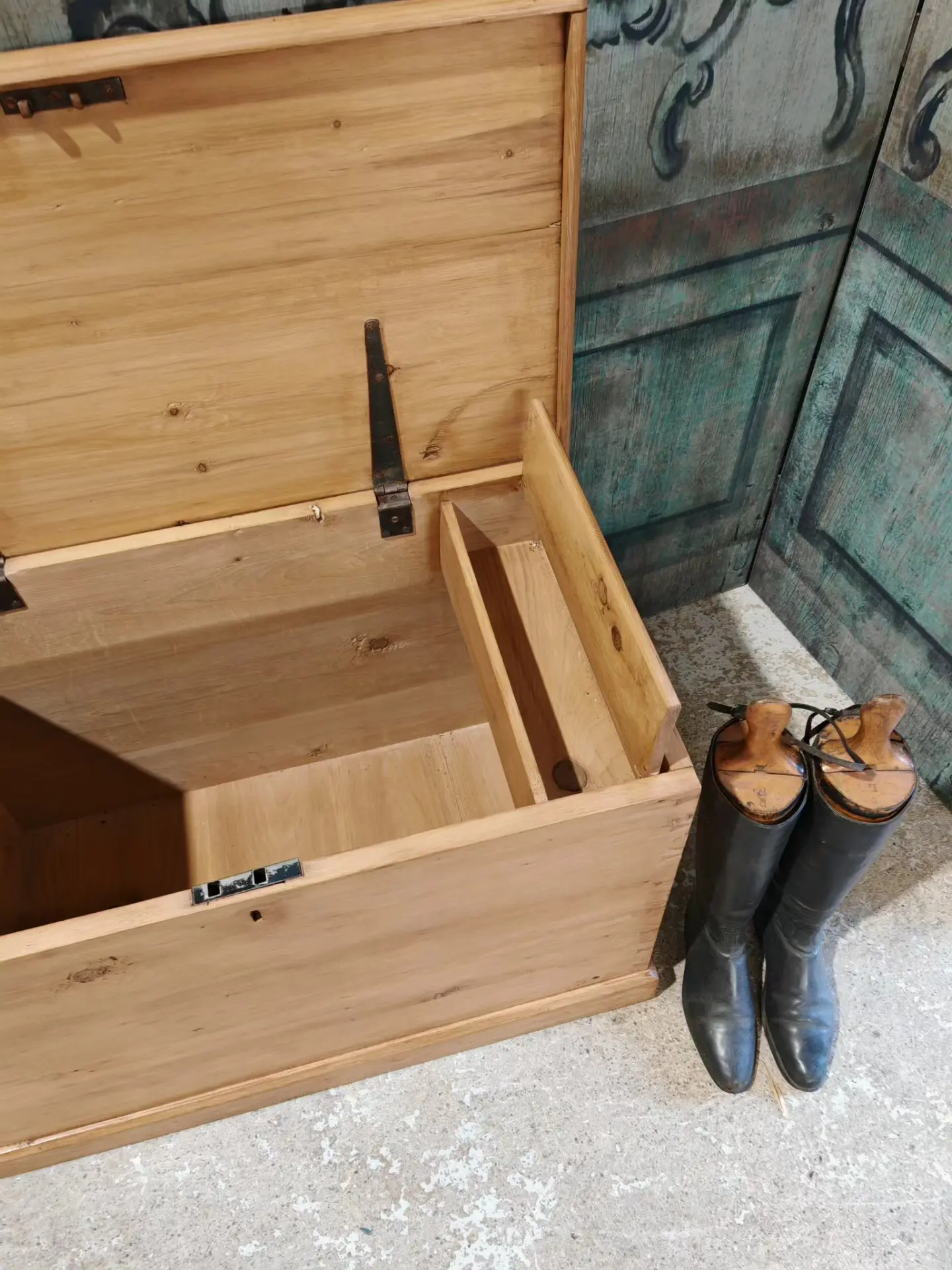 restored Victorian bedding box with candle tray