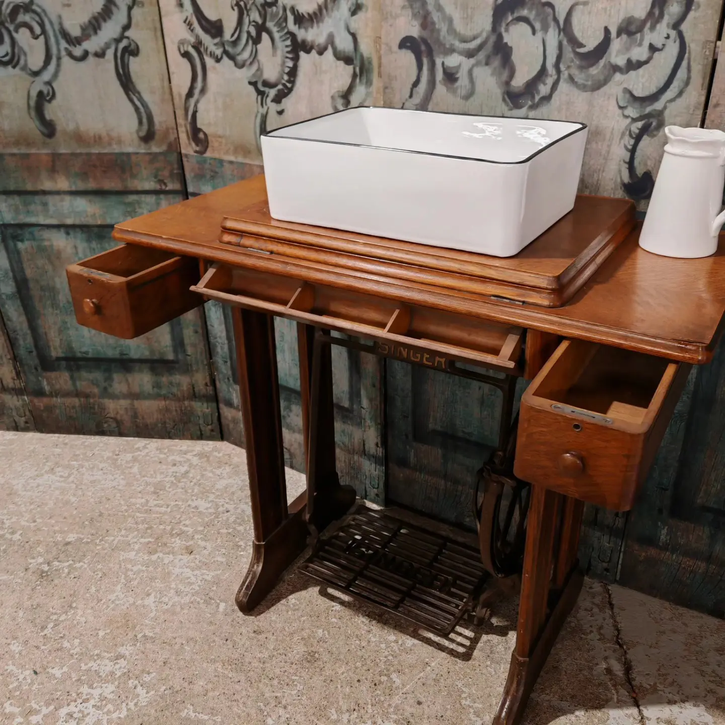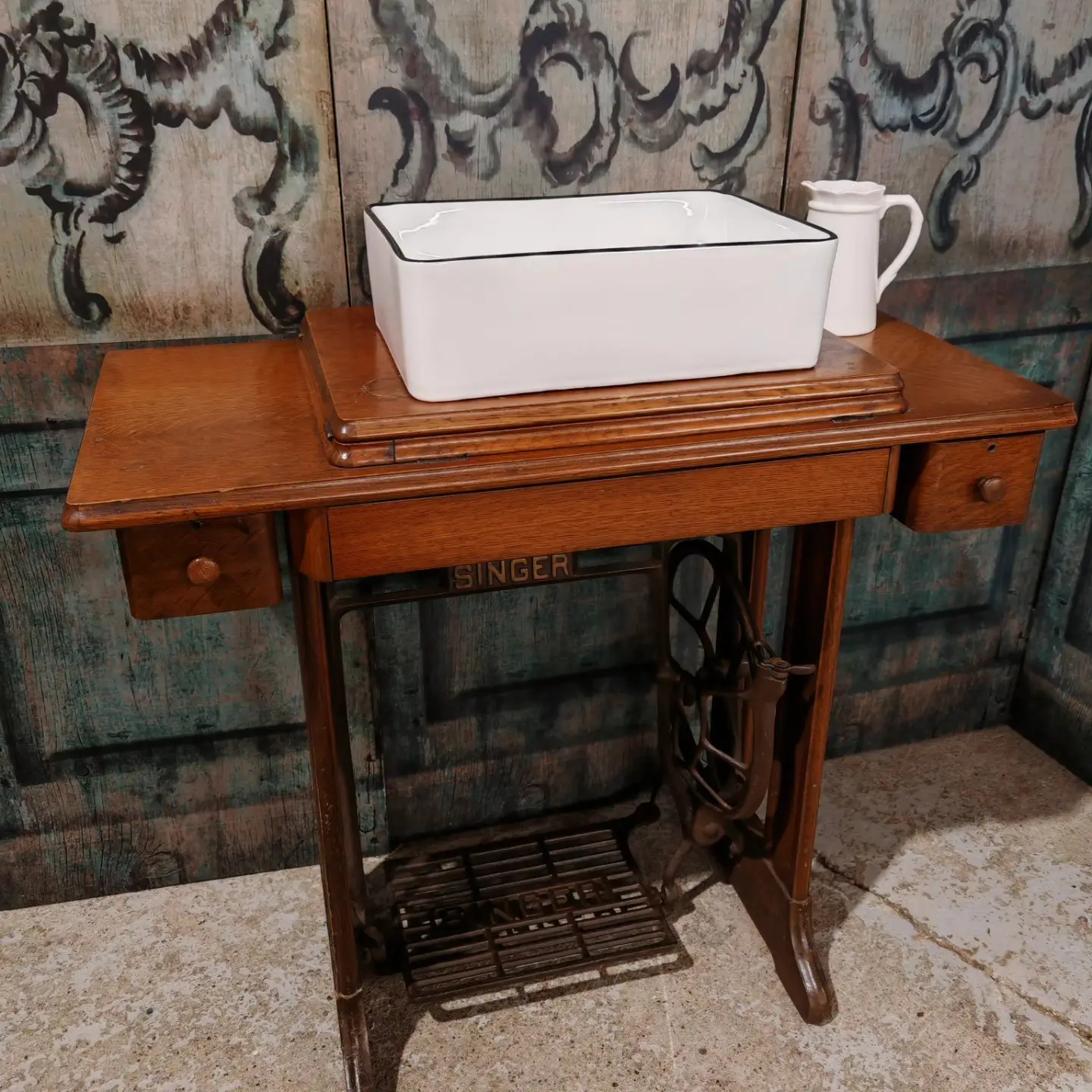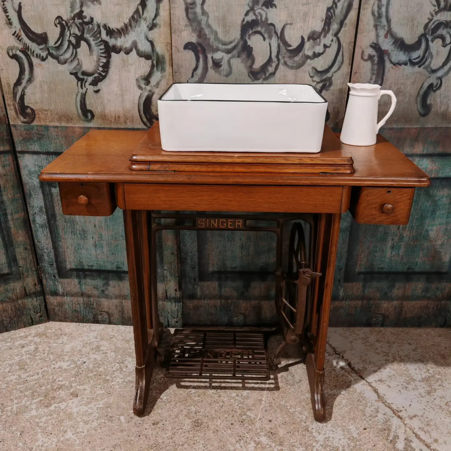 ‘Be brave, be different’ with this original Singer sewing machine table base as a fantastic vanity unit.