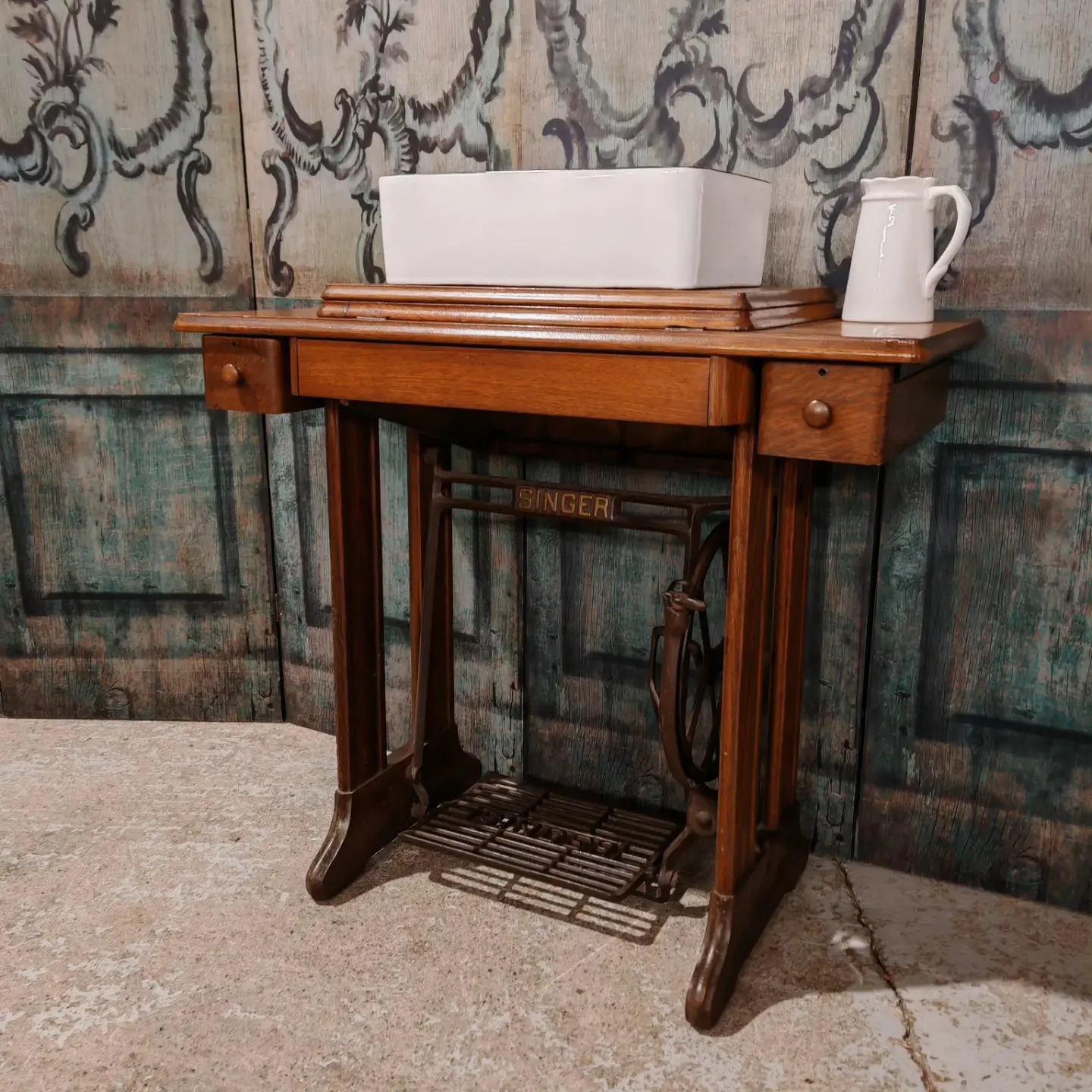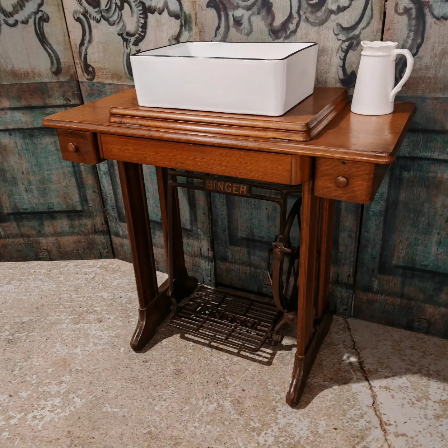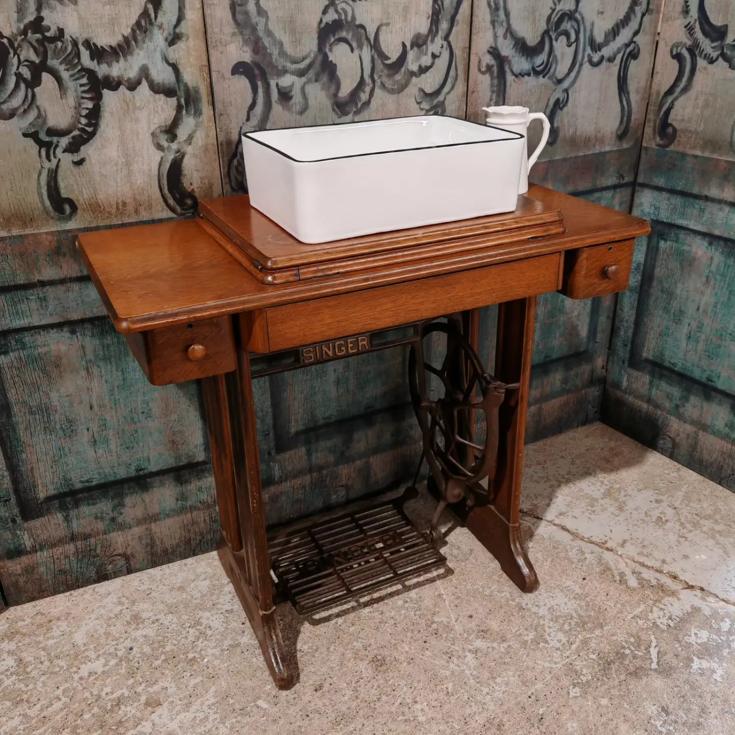 ‘Be brave, be different’ with this original Singer sewing machine table base as a fantastic vanity unit.