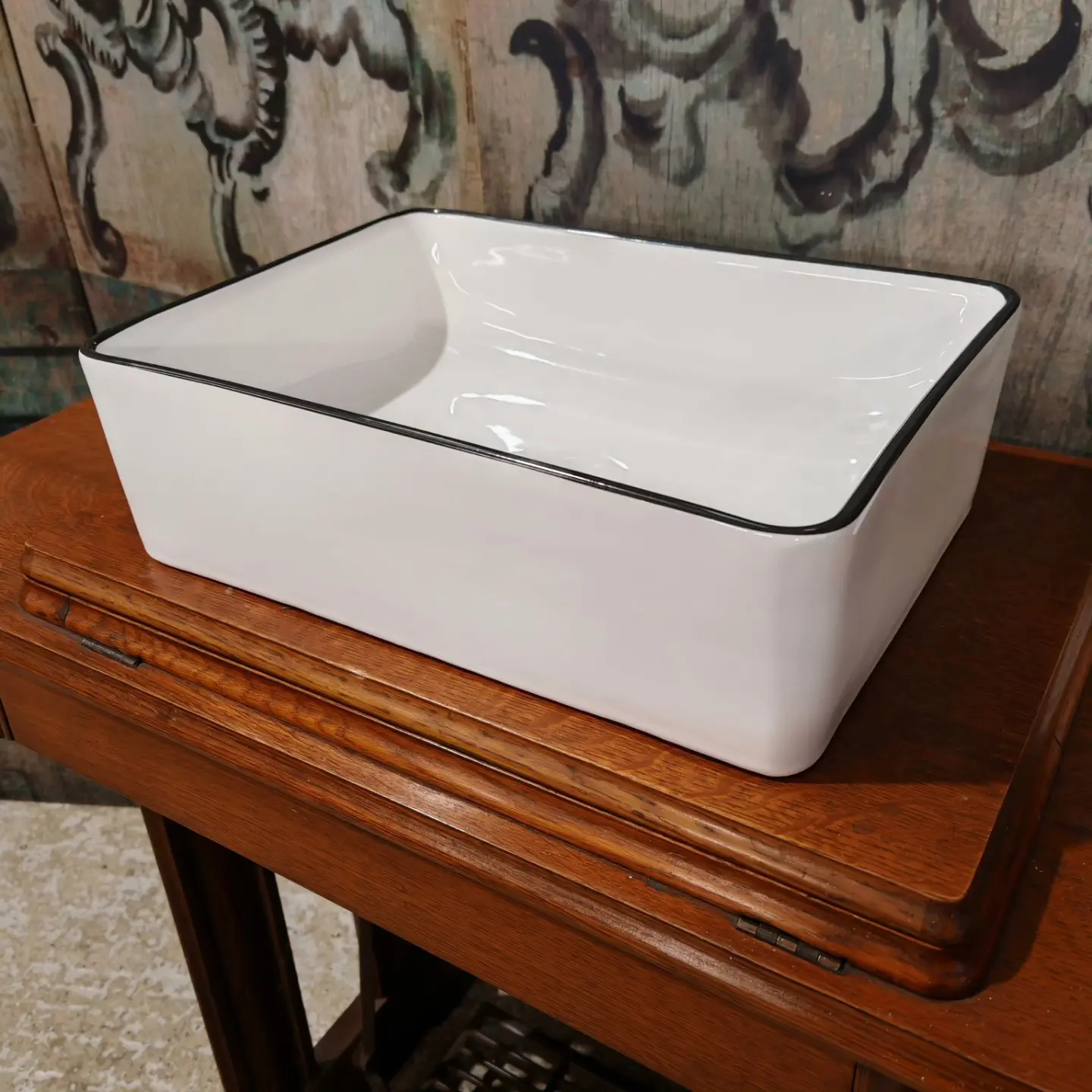 Supplied with the sewing machine removed and with a brand new porcelain sink with black trim.
