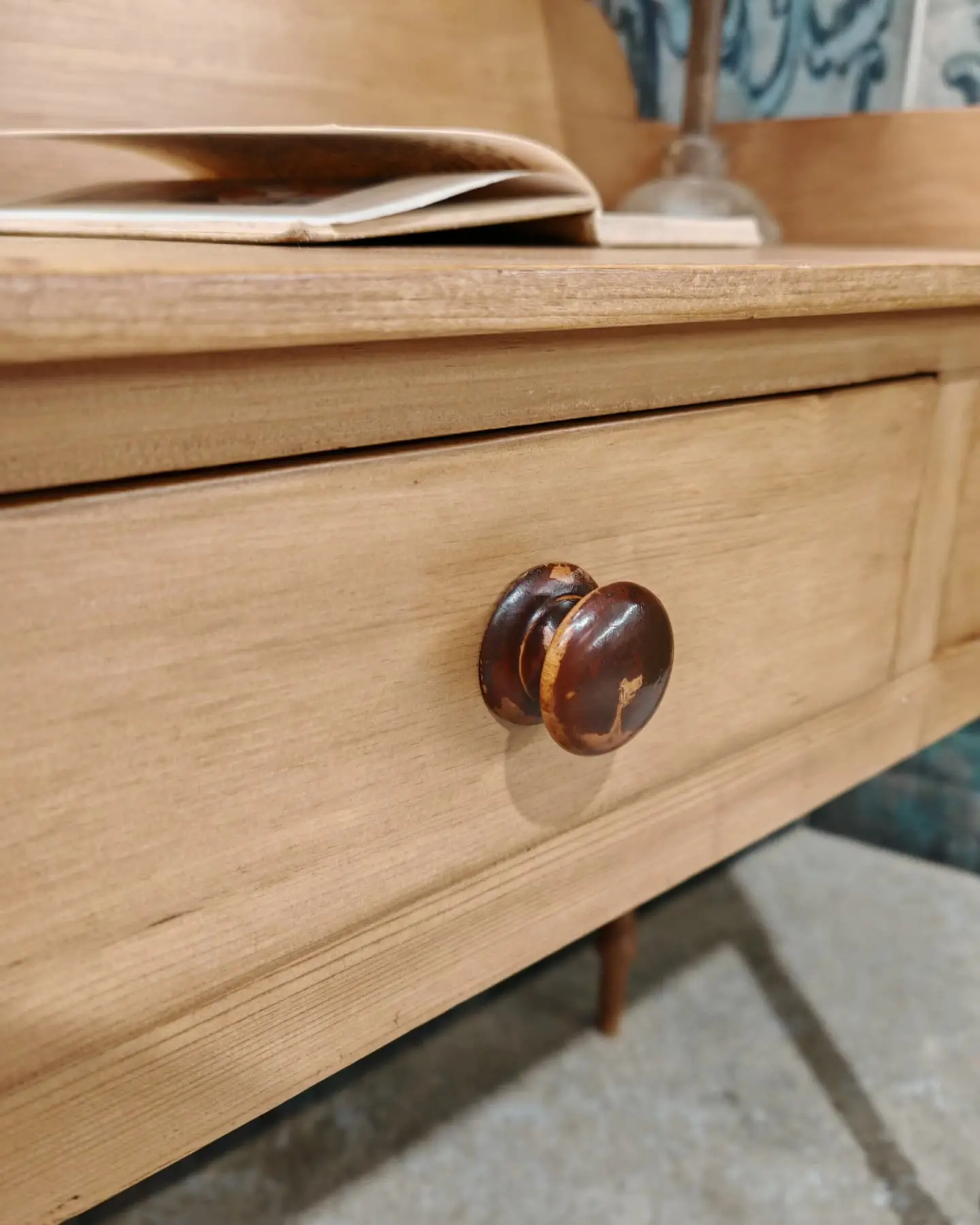 This item was in heavy gloss paint before the restoration started and now looks 100% better. All beautifully hand waxed in briwax medium brown p7.