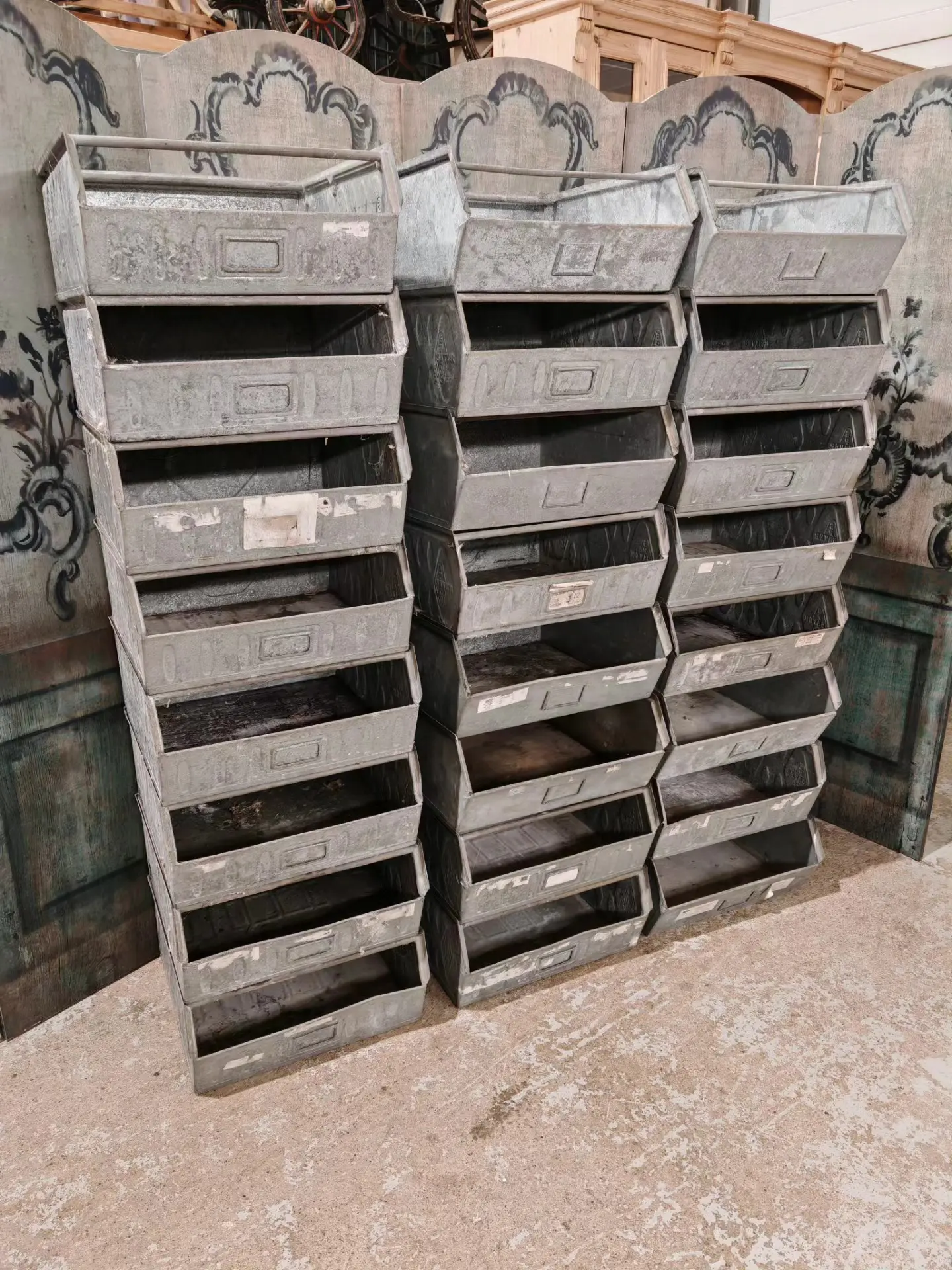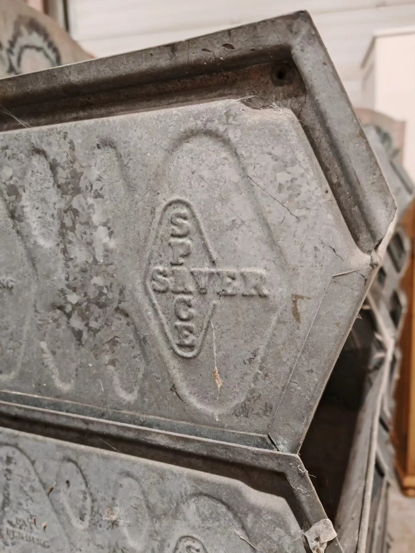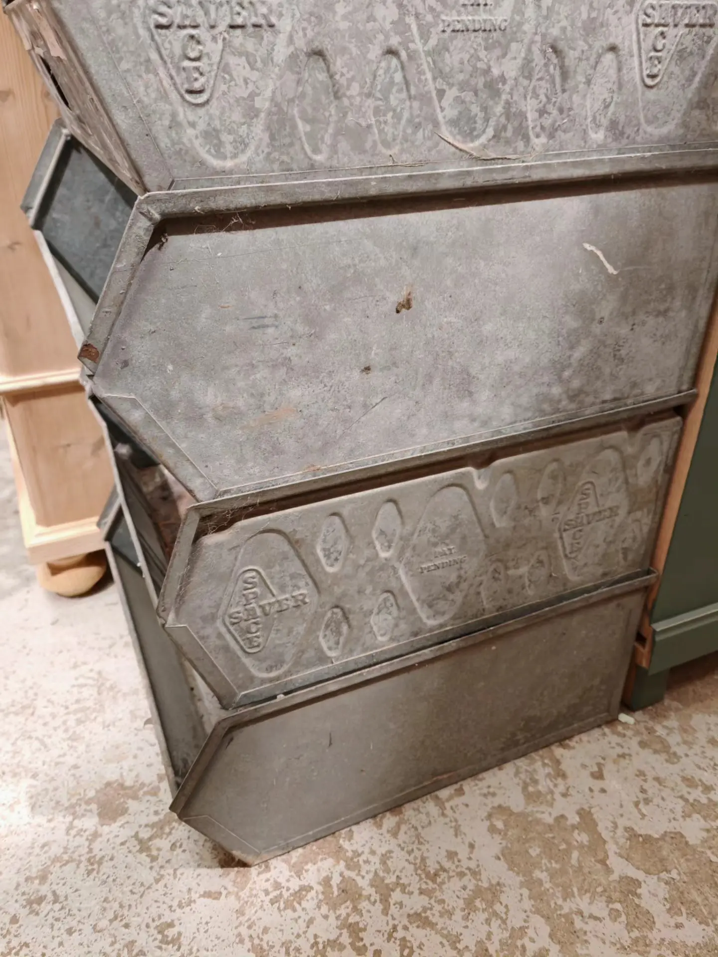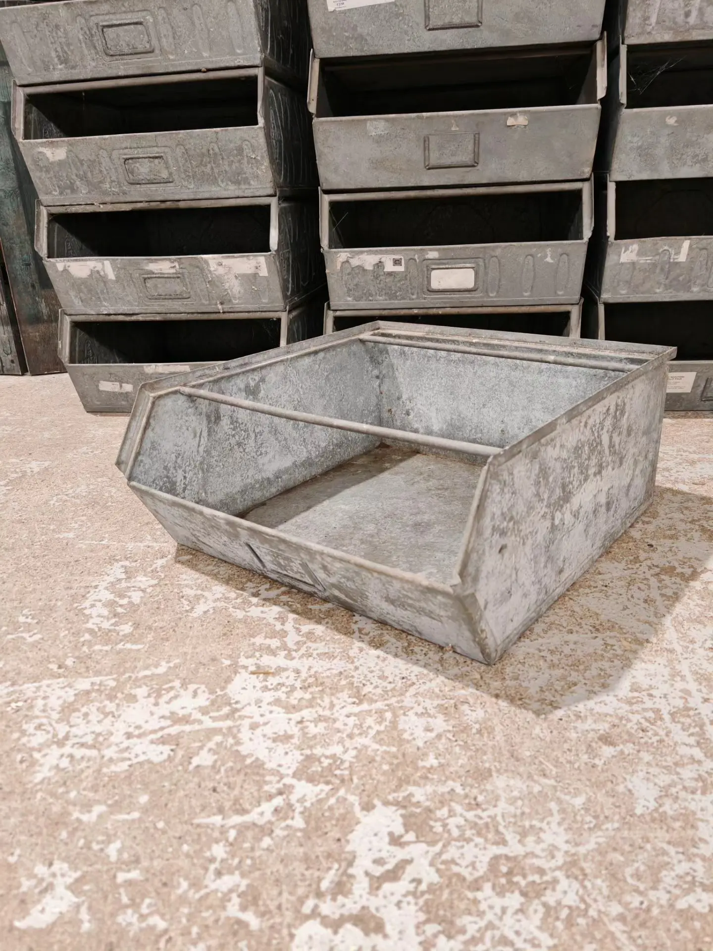 Vintage galvanised steel parts bins, also known as tote pans or storage boxes, often used for industrial storage of small components. The word “SPACE SAVER” is embossed on the sides.