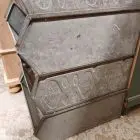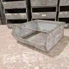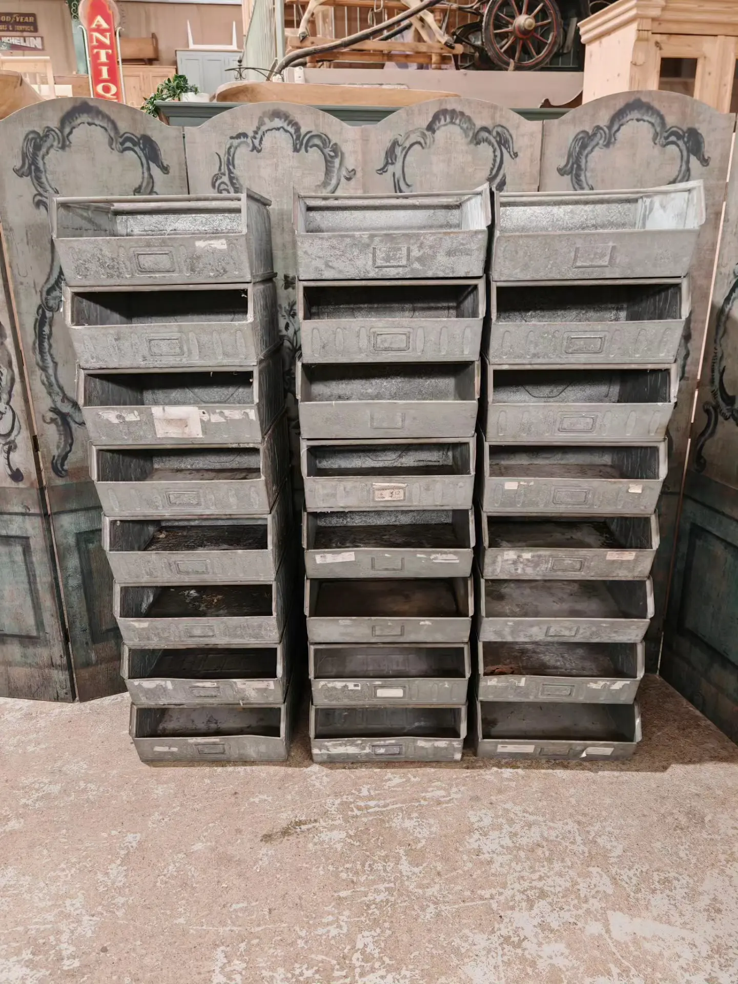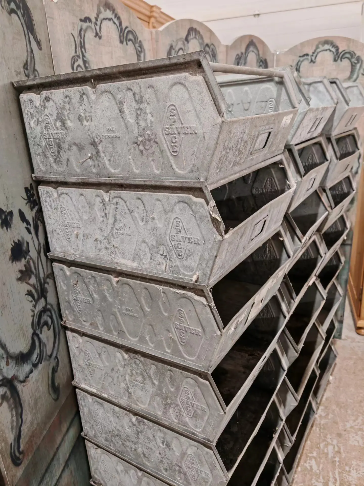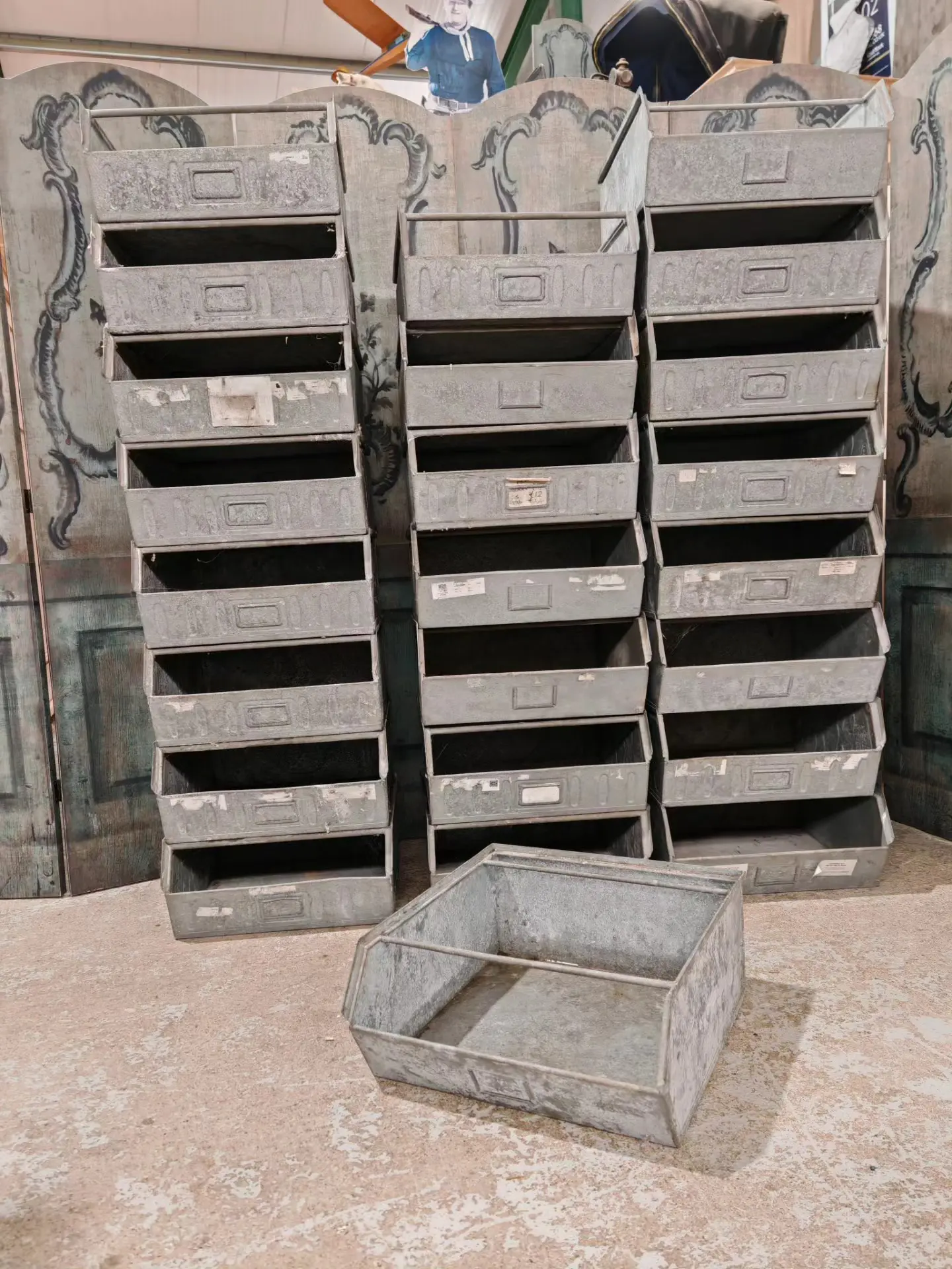 Vintage galvanised steel parts bins, also known as tote pans or storage boxes, often used for industrial storage of small components. The word “SPACE SAVER” is embossed on the sides.